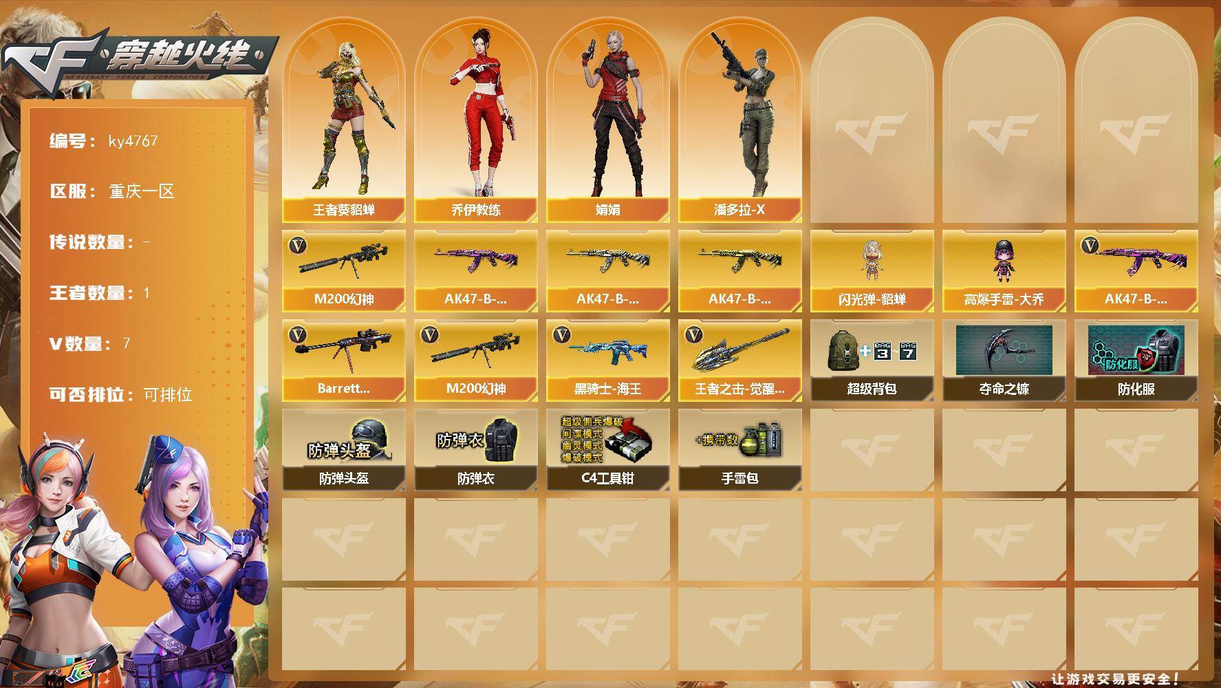 [17261450]重庆一区-7V-1王者-0炫金 【热门武器】:M200-幻神 【皮肤】:AK47-B-常胜将军-曹操,AK47-B-常胜将军-刘备,AK47-B-常胜将军-孙权 【角色】:王者-葵-貂蝉,乔伊教练,娟娟,潘多拉-X 【人偶武器】:闪光弹-貂蝉,高爆手雷-大乔 【英雄级武器】:黑骑士-海王,AK47-B-常胜将军,Barrett-毁灭,M200-幻神,王者之击-觉醒版 【道具】:超级背包,夺命之镰,防化服,防弹头盔,防弹衣,C4工具钳*2,手雷包 【特殊枪械】: