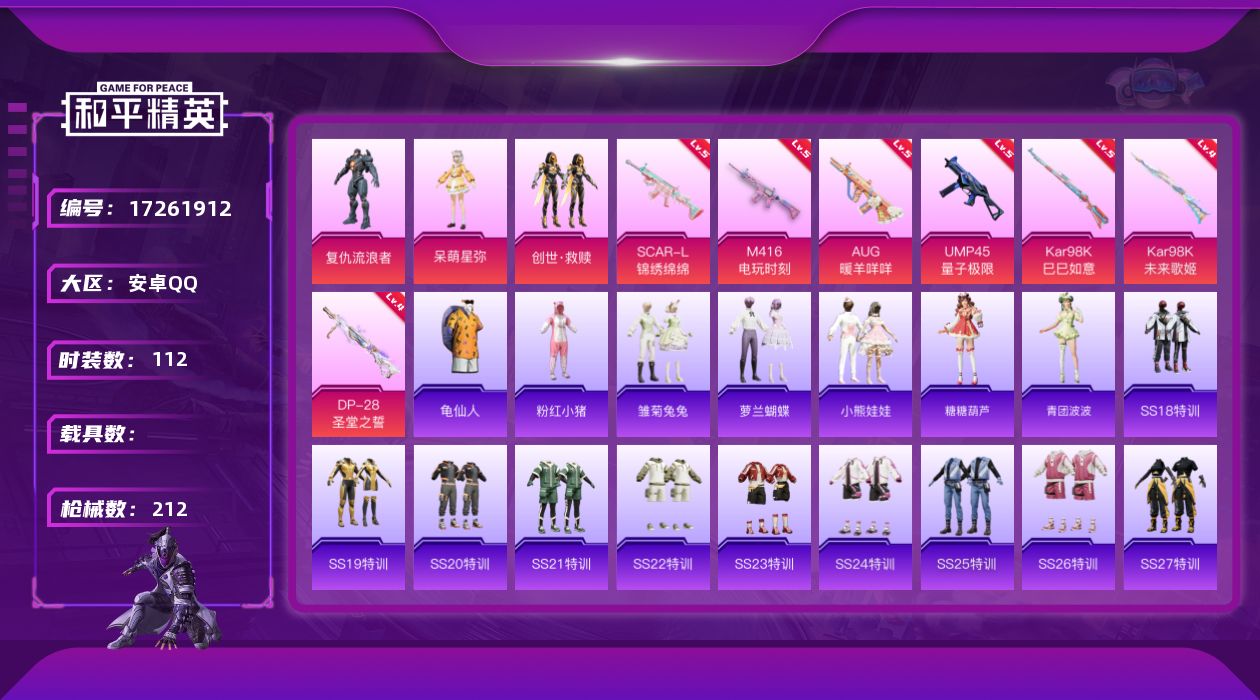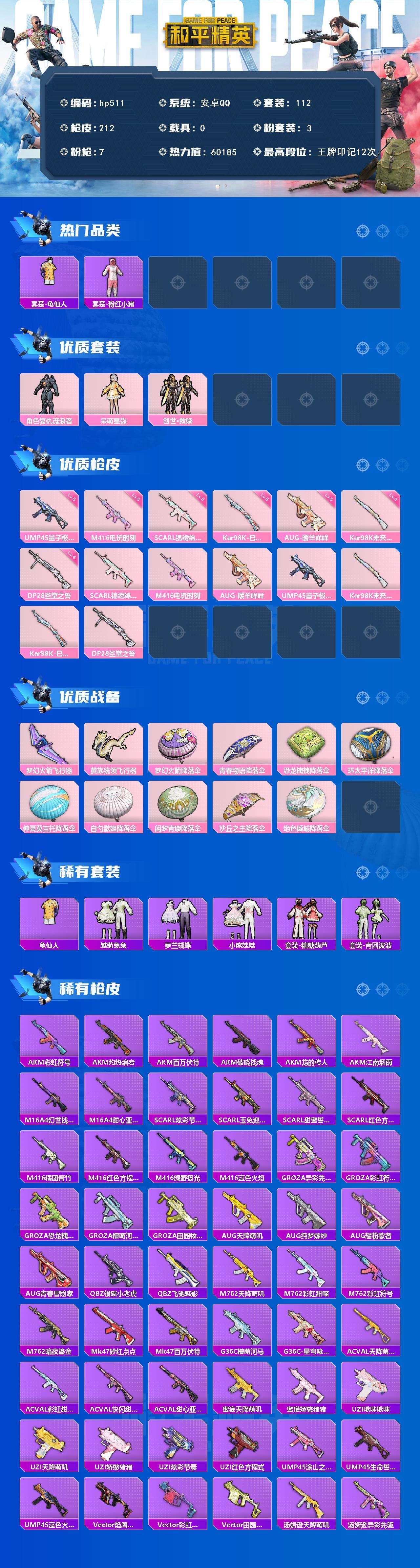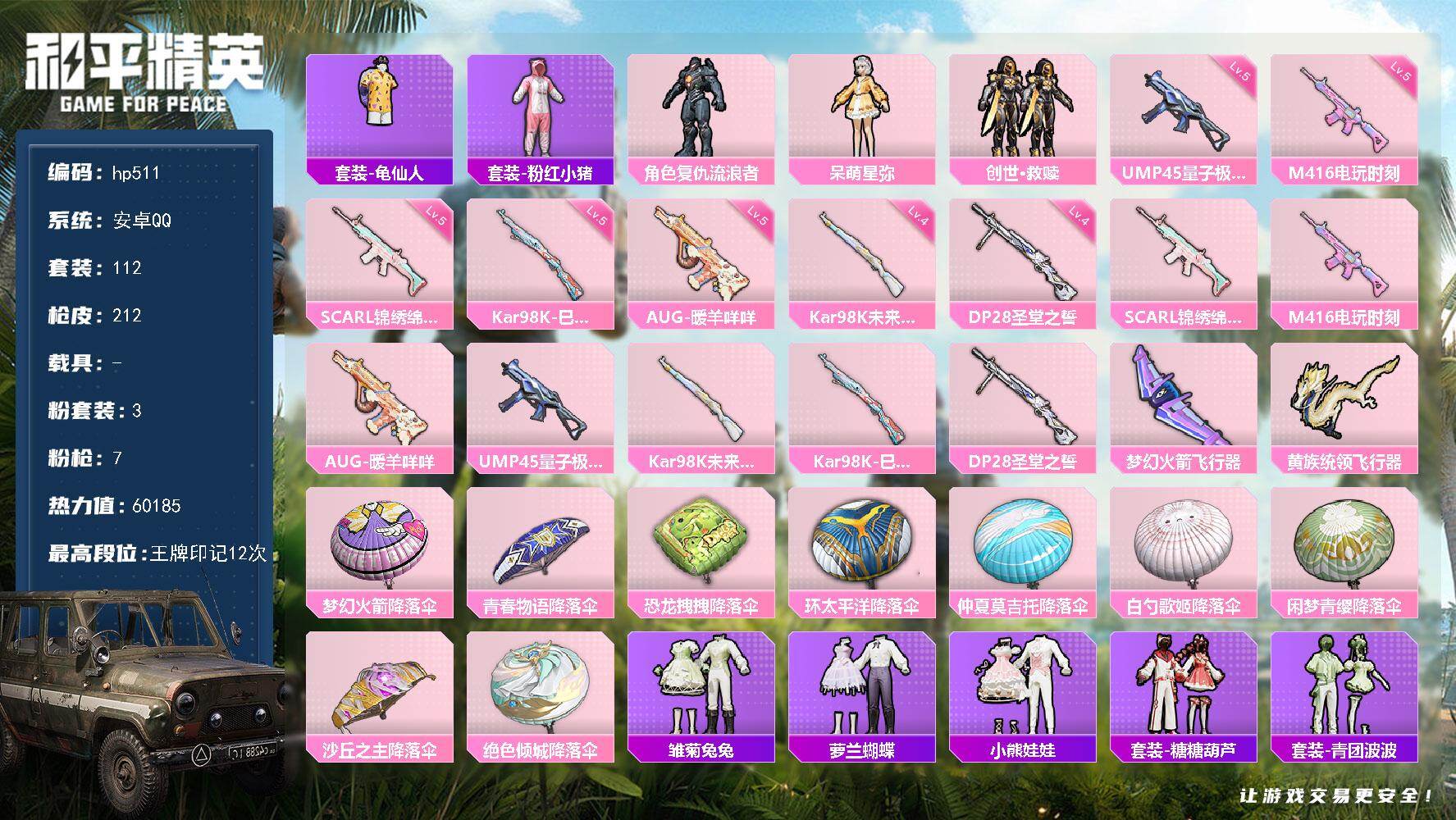 [17261912]安卓 手Q-3粉装-7特效枪-0载具-3粉色飞行器-60185热力值-12王牌印记-112套装-212枪皮 【热门品类】:套装-龟仙人,套装-粉红小猪 【粉色套装】:角色-复仇流浪者,角色-呆萌星弥,套装-创世·救赎 【粉色枪皮等级】:SCAR-L-锦绣绵绵(五级),M416-电玩时刻(五级),AUG-暖羊咩咩(五级),UMP45-量子极限(五级),Kar98K-未来歌姬(四级),Kar98K-巳巳如意(五级),DP-28-圣堂之誓(四级) 【粉色枪皮】:SCAR-L-锦绣绵绵,M416-电玩时刻,AUG-暖羊咩咩,UMP45-量子极限,Kar98K-未来歌姬,Kar98K-巳巳如意,DP-28-圣堂之誓 【粉色飞行器】:梦幻火箭飞行器,黄族统领飞行器 【粉色降落伞】:梦幻火箭降落伞,青春物语降落伞,恐龙拽拽降落伞,环太平洋降落伞,仲夏莫吉托降落伞,白勺歌姬降落伞,闲梦青缨降落伞,沙丘之主降落伞,绝色倾城降落伞 【稀有套装】:套装-龟仙人,套装-雏菊兔兔,套装-萝兰蝴蝶,套装-小熊娃娃,套装-糖糖葫芦,套装-青团波波 【稀有枪皮】:AKM-彩虹符号,AKM-江南烟雨,AKM-灼热熔岩,AKM-百万伏特,AKM-破晓战魂,AKM-龙的传人,M16A4-幻世战舞者,M16A4-甜心亚梦,SCAR-L-炫彩节奏,SCAR-L-玉兔迎春,SCAR-L-甜蜜誓约,SCAR-L-红色方程式,M416-糯团青竹,M416-红色方程式,M416-绿野极光,M416-蓝色火焰,GROZA-异彩先驱,GROZA-彩虹符号,GROZA-恐龙拽拽,GROZA-懵萌河马,GROZA-田园牧歌,AUG-天降萌叽,AUG-纯梦嫁纱,AUG-耀粉歌者,AUG-青春冒险家,QBZ-银碳小老虎,QBZ-飞驰魅影,M762-天降萌叽,M762-彩虹甜喵,M762-彩虹符号,M762-暗夜鎏金,Mk47-妙红点点,Mk47-百万伏特,G36C-懵萌河马,G36C-星穹咏叹调,AC-VAL-天降萌叽,AC-VAL-彩虹甜喵,AC-VAL-快闪甜心,AC-VAL-甜心亚梦,蜜獾-天降萌叽,蜜獾-娇憨猪猪,UZI-啾咪啾咪,UZI-天降萌叽,UZI-娇憨猪猪,UZI-炫彩节奏,UZI-红色方程式,UMP45-涂山之恋,UMP45-生命誓言,UMP45-蓝色火焰,Vector-焰鹰斗篷,Vector-彩虹符号,