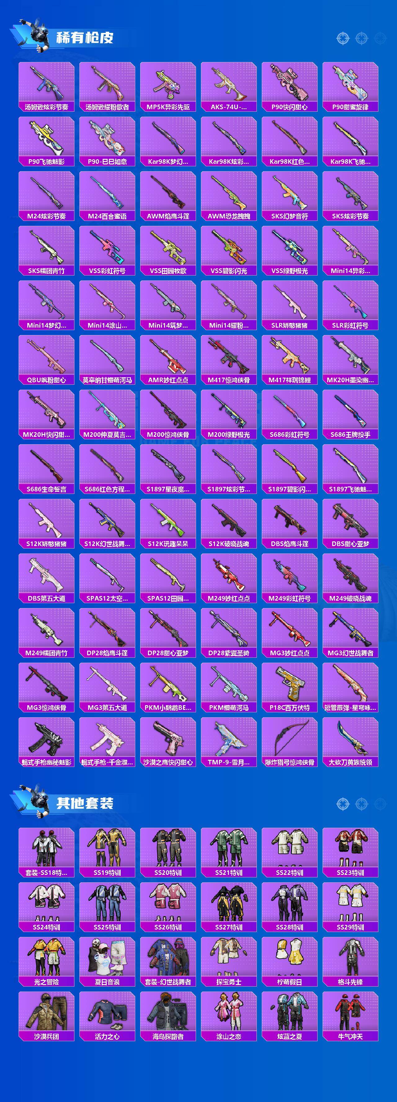 【稀有枪皮】:AKM-彩虹符号,AKM-江南烟雨,AKM-灼热熔岩,AKM-百万伏特,AKM-破晓战魂,AKM-龙的传人,M16A4-幻世战舞者,M16A4-甜心亚梦,SCAR-L-炫彩节奏,SCAR-L-玉兔迎春,SCAR-L-甜蜜誓约,SCAR-L-红色方程式,M416-糯团青竹,M416-红色方程式,M416-绿野极光,M416-蓝色火焰,GROZA-异彩先驱,GROZA-彩虹符号,GROZA-恐龙拽拽,GROZA-懵萌河马,GROZA-田园牧歌,AUG-天降萌叽,AUG-纯梦嫁纱,AUG-耀粉歌者,AUG-青春冒险家,QBZ-银碳小老虎,QBZ-飞驰魅影,M762-天降萌叽,M762-彩虹甜喵,M762-彩虹符号,M762-暗夜鎏金,Mk47-妙红点点,Mk47-百万伏特,G36C-懵萌河马,G36C-星穹咏叹调,AC-VAL-天降萌叽,AC-VAL-彩虹甜喵,AC-VAL-快闪甜心,AC-VAL-甜心亚梦,蜜獾-天降萌叽,蜜獾-娇憨猪猪,UZI-啾咪啾咪,UZI-天降萌叽,UZI-娇憨猪猪,UZI-炫彩节奏,UZI-红色方程式,UMP45-涂山之恋,UMP45-生命誓言,UMP45-蓝色火焰,Vector-焰鹰斗篷,Vector-彩虹符号,
