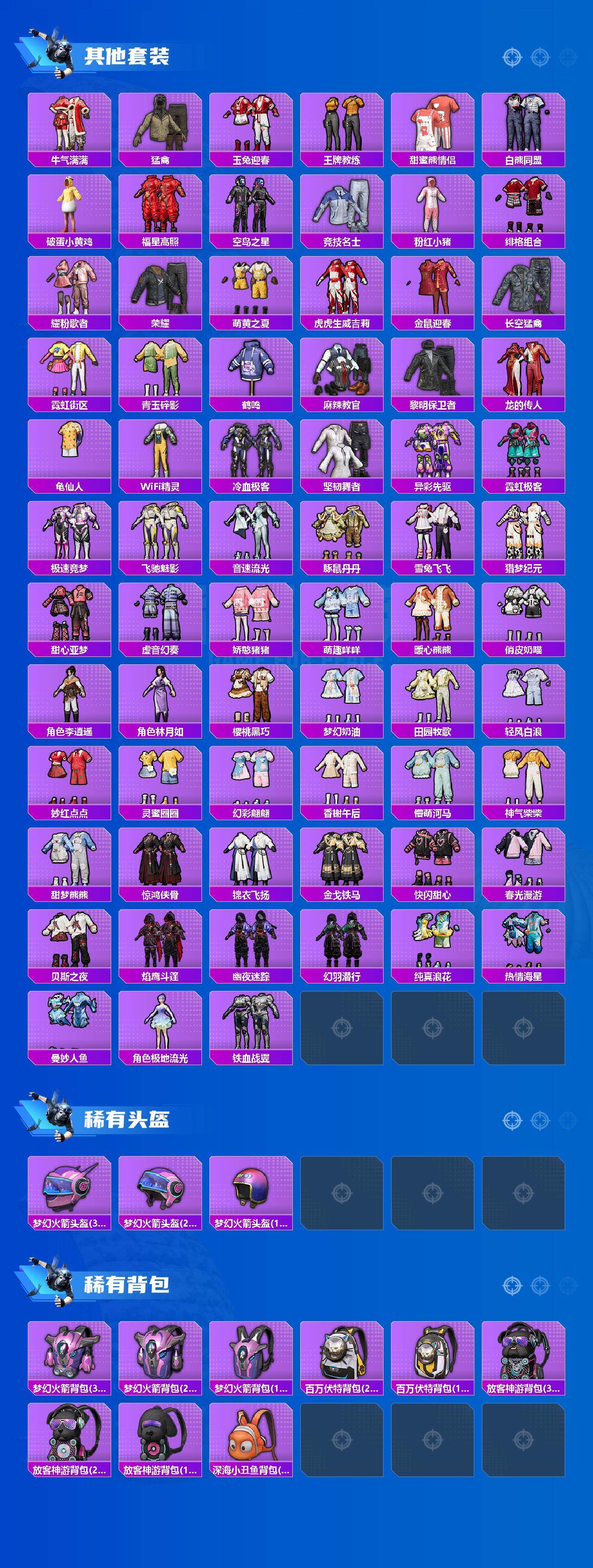 SCAR-L-锦绣绵绵,M416-电玩时刻,AUG-暖羊咩咩,UMP45-量子极限,Kar98K-未来歌姬,Kar98K-巳巳如意,DP-28-圣堂之誓