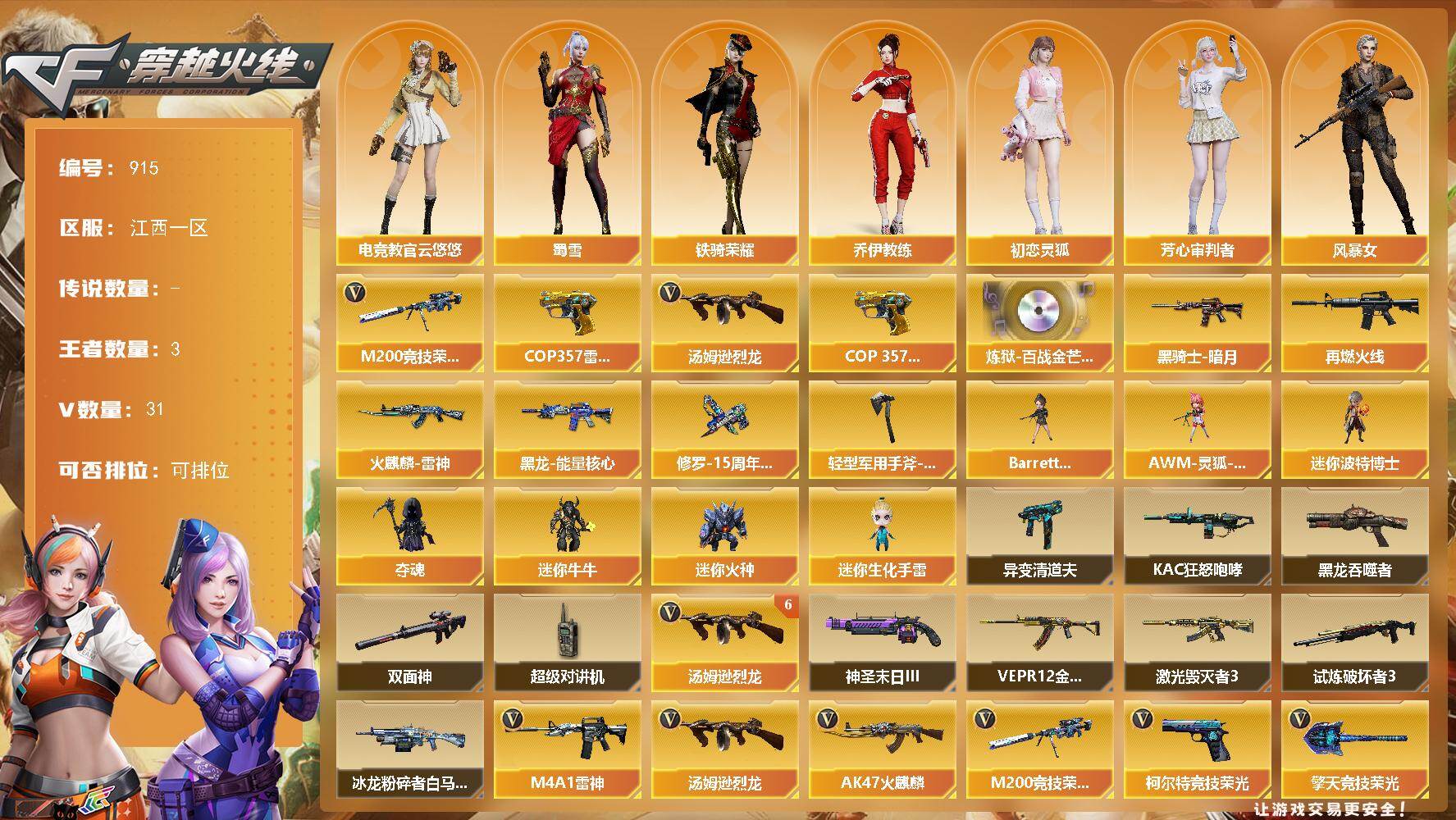 [17168275]江西一区-31V-3王者-0炫金 【热门武器】:M200-竞技荣光,汤姆逊-烈龙*6,COP 357-雷霆王者 【王者炫金武器】:COP 357-雷霆王者 【音效卡】:炼狱-百战金芒-庆典舞曲音效卡 【皮肤】:M4A1-再燃火线,火麒麟-雷神,黑龙-能量核心,黑骑士-暗月*2,修罗-15周年嘉年华 皮肤,轻型军用手斧-再燃火线 【角色】:电竞教官-云悠悠,乔伊教练,初恋灵狐,芳心审判者,风暴女,虎妞,嘉年华灵狐,娟娟,龙儿-小淘气,麻雀,潘多拉-甜心教官,斯沃特-X,蜀雪,铁骑荣耀,樱-战斗天使,游珑儿 【人偶武器】:AWM-灵狐-15周年嘉年华,迷你波特博士*2,夺魂,迷你牛牛,迷你火种,迷你生化手雷*3,Barrett-夜玫瑰 【暴走生化】:异变清道夫*2,KAC-狂怒咆哮,黑龙吞噬者,双面神,超级对讲机 【挑战大师】:冰龙粉碎者-白马银枪,VEPR-12-金魔,激光毁灭者III,试炼破坏者III,神圣爆裂者-末日III 【英雄级武器】:AK47-火麒麟,M4A1-雷神*2,无影-神兵利器,黑武士-锦绣游龙,QBZ03-独角-IV,烈火-动感闪耀,AK-47-猩红传说,M200-竞技荣光,王者蔷薇-觉醒版,炼狱-百战金芒,汤姆逊-烈龙*6,柯尔特-竞技荣光,天神-动感闪耀,擎天-竞技荣光,屠龙-动感闪耀,麒麟刺-百战金芒,高爆手雷-竞技荣光,手雷-动感闪耀,闪光弹-竞技荣光,烟雾弹-竞技荣光 【道具】:亚洲杯纪念炫彩背包,百战金芒炫彩背包,背包-洛丽塔,虎牙炫彩背包,超级背包,圣拳猎手-炽雪,女皇终结者-魔龙之吻,救世主-黑桃战神,绿色巨人,灵魂忍者,迷雾幽灵,生化弹匣,夺命之镰,防化服*2,金色流光-枪王排位*2,流光-鎏金之域,流光-再燃火线,语音特效-盛典烟火,萌萌小葵表情,电玩兔兔表情,炽雪表情,动感闪耀表情,EP战队名片,防弹头盔*8,防弹衣*8,C4工具钳*8,手雷包*8 【特殊枪械】:6烈龙