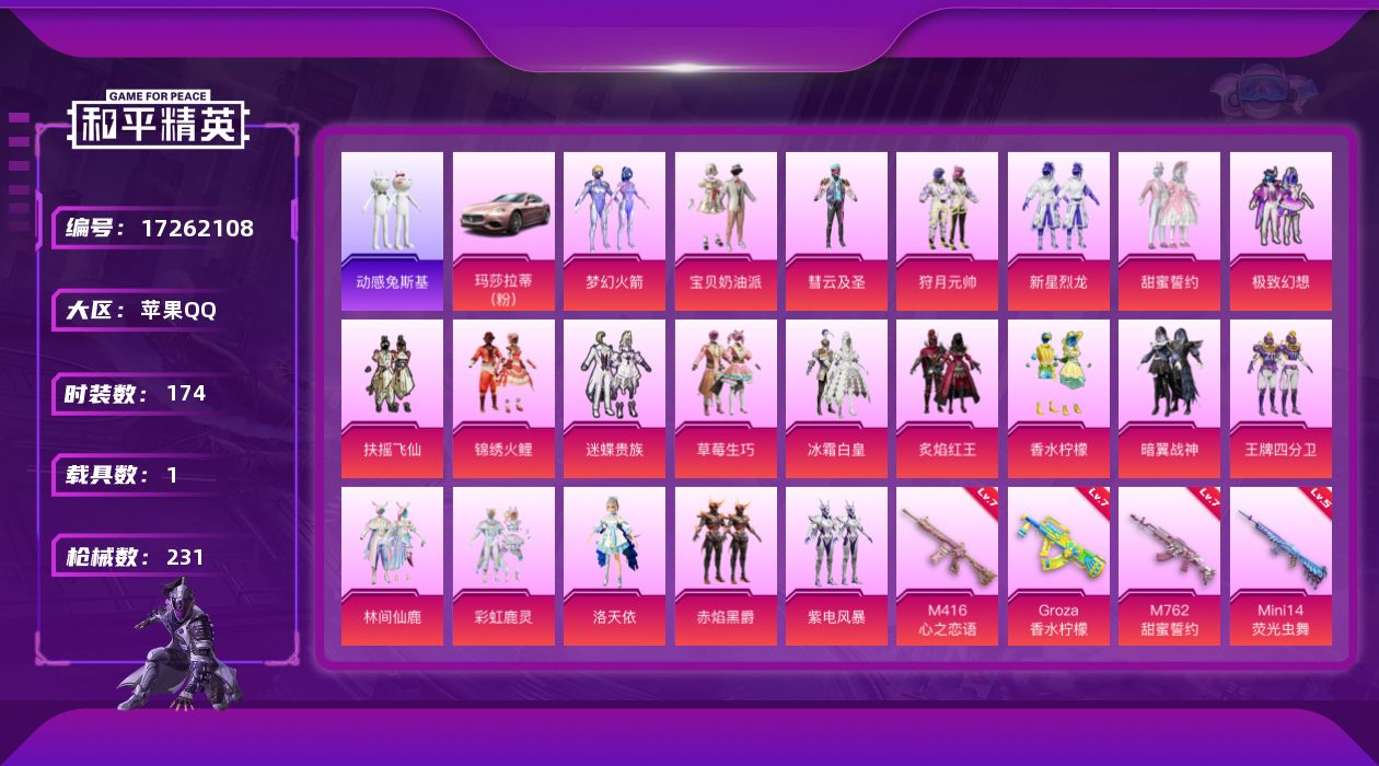 [17262108]苹果 手Q-22粉装-8特效枪-1载具-5粉色飞行器-83807热力值-9王牌印记-174套装-231枪皮