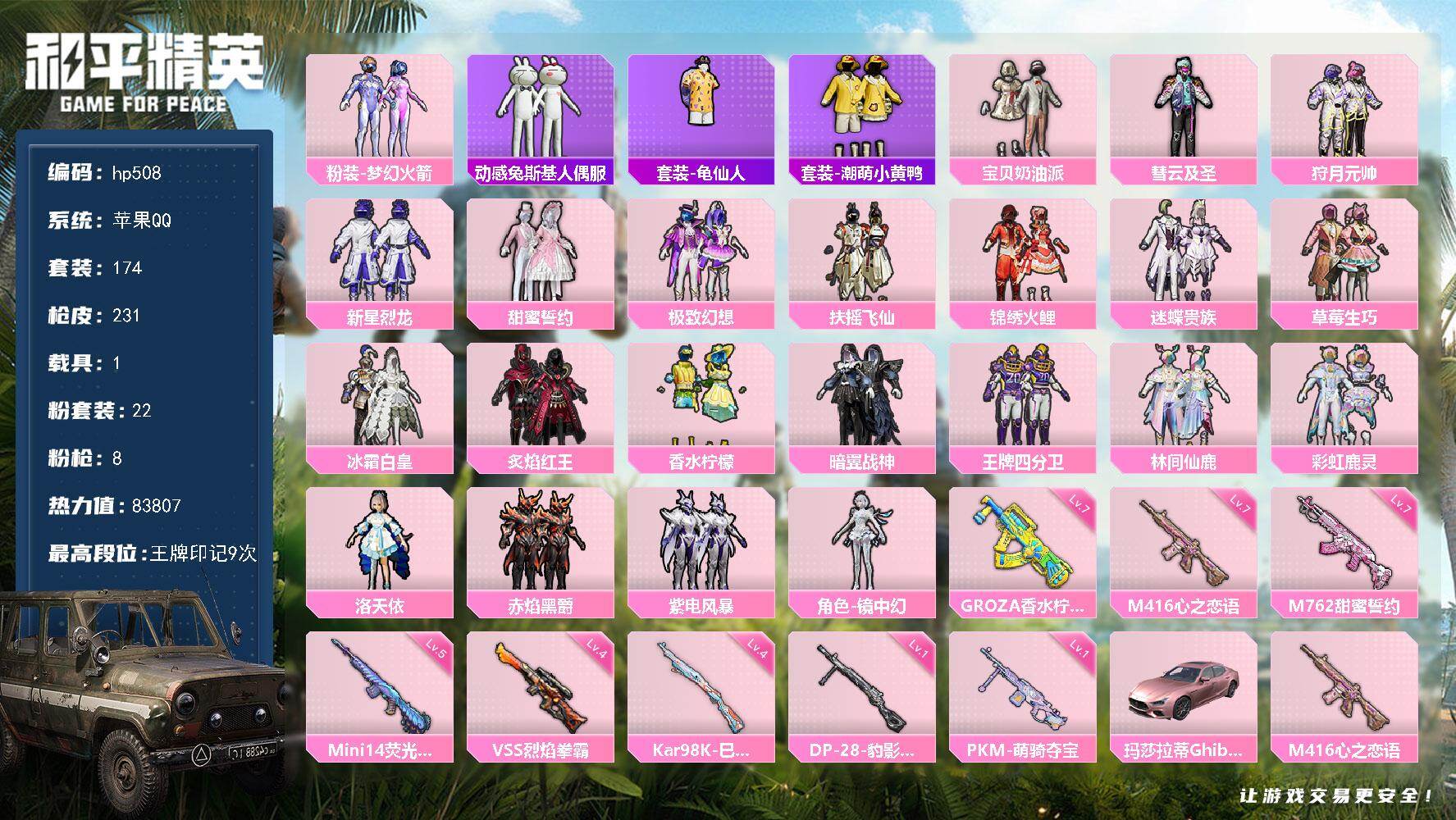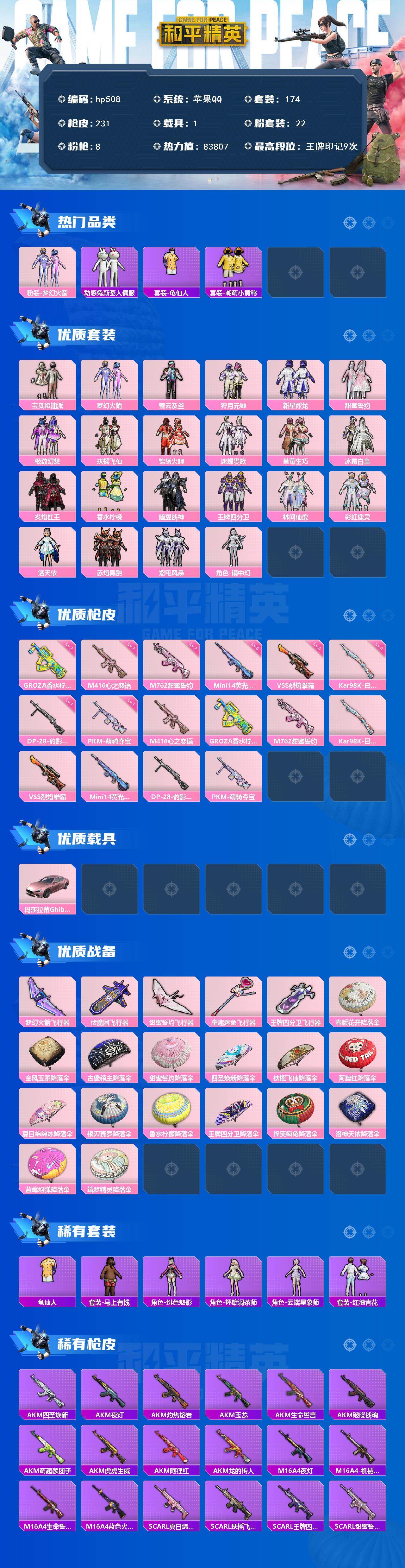[17262108]苹果 手Q-22粉装-8特效枪-1载具-5粉色飞行器-83807热力值-9王牌印记-174套装-231枪皮 【热门品类】:粉装-梦幻火箭,套装-动感兔斯基人偶服,套装-龟仙人,套装-潮萌小黄鸭 【粉色套装】:粉装-宝贝奶油派,粉装-梦幻火箭,粉装-彗云及圣,粉装-狩月元帅,粉装-新星烈龙,粉装-甜蜜誓约,粉装-极致幻想,粉装-扶摇飞仙,粉装-锦绣火鲤,粉装-迷蝶贵族,粉装-草莓生巧,粉装-冰霜白皇,粉装-炙焰红王,粉装-香水柠檬,粉装-暗翼战神,粉装-王牌四分卫,粉装-林间仙鹿,粉装-彩虹鹿灵,角色-洛天依,粉装-赤焰黑爵,粉装-紫电风暴,角色-镜中幻 【粉色枪皮等级】:M416-心之恋语(七级),GROZA-香水柠檬(七级),M762-甜蜜誓约(七级),Kar98K-巳巳如意(四级),VSS-烈焰拳霸(四级),Mini14-荧光虫舞(五级),DP-28-豹影疾电(一级),PKM-萌骑夺宝(一级) 【粉色载具】:玛莎拉蒂Ghibli(粉) 【粉色枪皮】:M416-心之恋语,GROZA-香水柠檬,M762-甜蜜誓约,Kar98K-巳巳如意,VSS-烈焰拳霸,Mini14-荧光虫舞,DP-28-豹影疾电,PKM-萌骑夺宝 【粉色飞行器】:梦幻火箭飞行器,伏魔团飞行器,甜蜜誓约飞行器,童趣迷兔飞行器,王牌四分卫飞行器 【粉色降落伞】:春暖花开降落伞,金风玉露降落伞,古堡领主降落伞,甜蜜誓约降落伞,四圣焕新降落伞,扶摇飞仙降落伞,阿狸红降落伞,夏日绵绵冰降落伞,银刃赛罗降落伞,香水柠檬降落伞,王牌四分卫降落伞,怪笑疯兔降落伞,洛神天依降落伞,蓝莓炮弹降落伞,筑梦精灵降落伞 【稀有套装】:套装-龟仙人,套装-马上有钱,角色-绯色魅影,角色-杯旋调茶师,角色-云端星象师,套装-红釉青花 【稀有枪皮】:AKM-四圣焕新,AKM-夜灯,AKM-灼热熔岩,AKM-玉龙,AKM-生命誓言,AKM-破晓战魂,AKM-萌趣颜团子,AKM-虎虎生威,AKM-阿狸红,AKM-龙的传人,M16A4-夜灯,M16A4-机械英豪,M16A4-生命誓言,M16A4-蓝色火焰,SCAR-L-夏日绵绵冰,SCAR-L-扶摇飞仙,SCAR-L-王牌四分卫,SCAR-L-甜蜜誓约,M416-神秘黑猫,M416-糯团青竹,M416-蓝色火焰,GROZA-异彩先驱,GROZA-彩虹符号,GROZA-恐龙拽拽,G