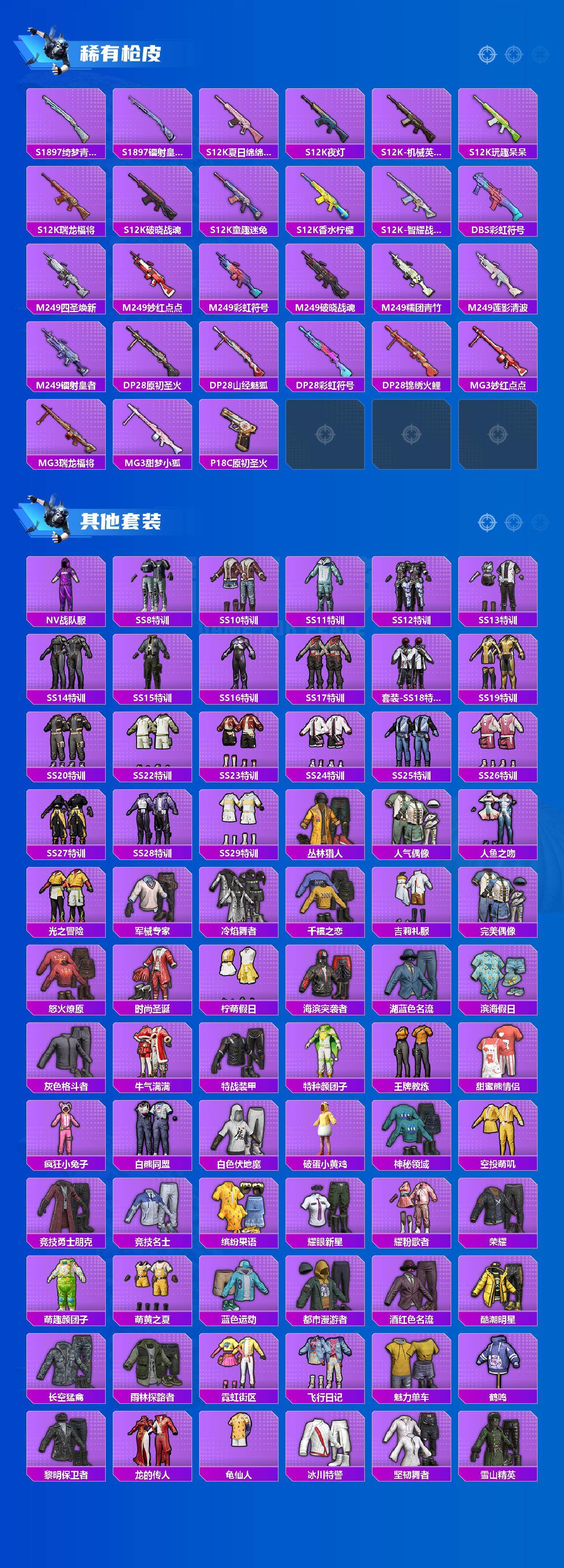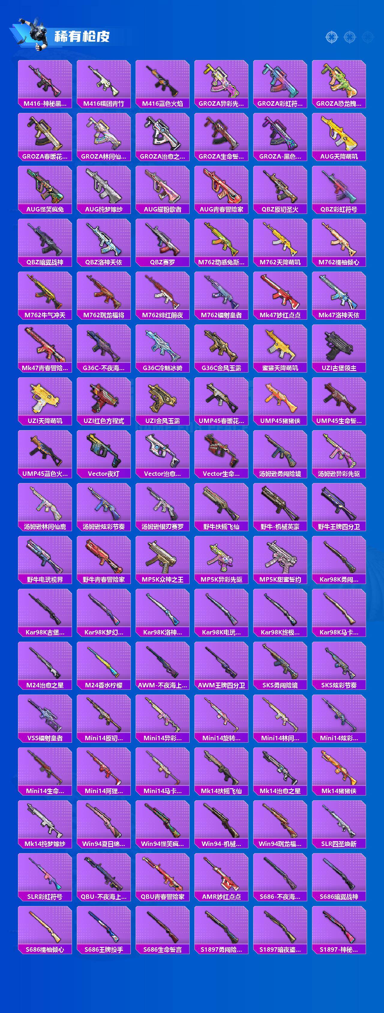 【稀有枪皮】:AKM-四圣焕新,AKM-夜灯,AKM-灼热熔岩,AKM-玉龙,AKM-生命誓言,AKM-破晓战魂,AKM-萌趣颜团子,AKM-虎虎生威,AKM-阿狸红,AKM-龙的传人,M16A4-夜灯,M16A4-机械英豪,M16A4-生命誓言,M16A4-蓝色火焰,SCAR-L-夏日绵绵冰,SCAR-L-扶摇飞仙,SCAR-L-王牌四分卫,SCAR-L-甜蜜誓约,M416-神秘黑猫,M416-糯团青竹,M416-蓝色火焰,GROZA-异彩先驱,GROZA-彩虹符号,GROZA-恐龙拽拽,G