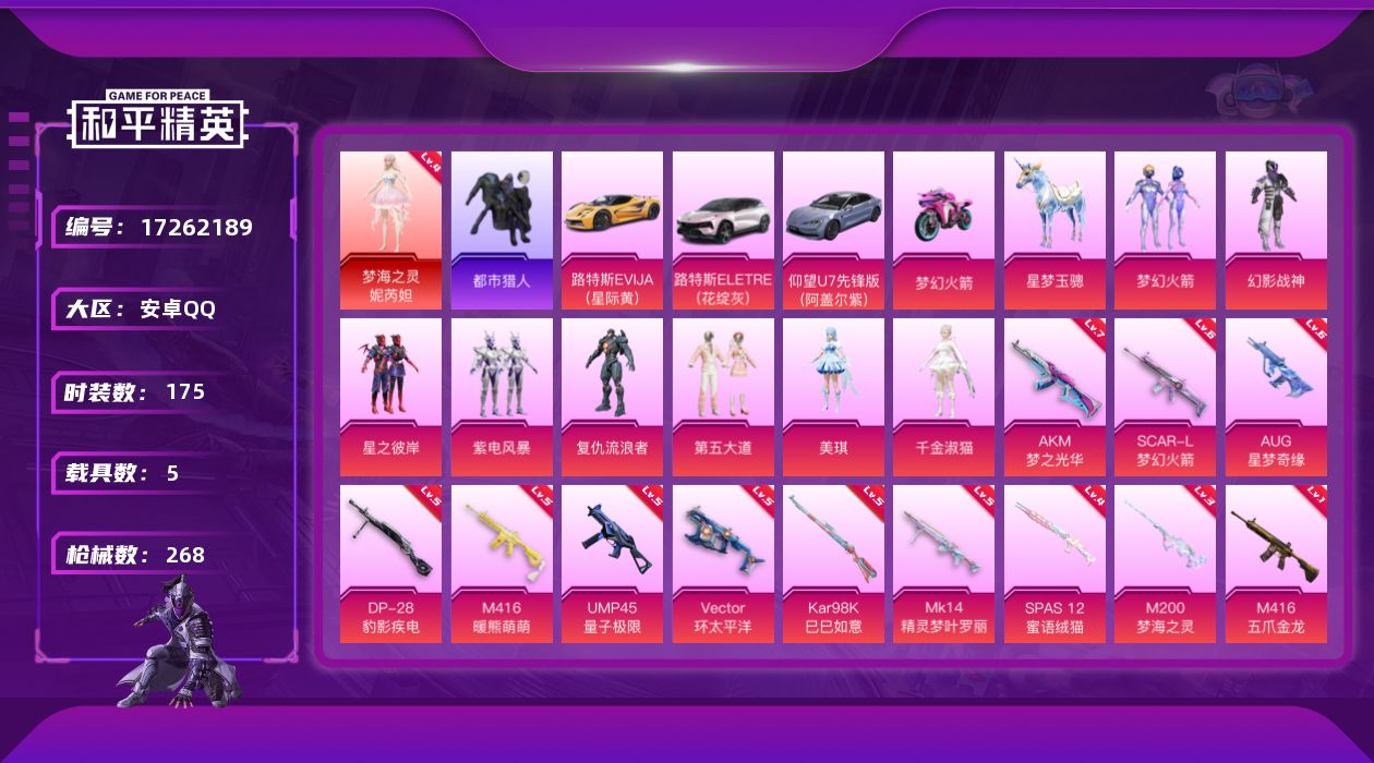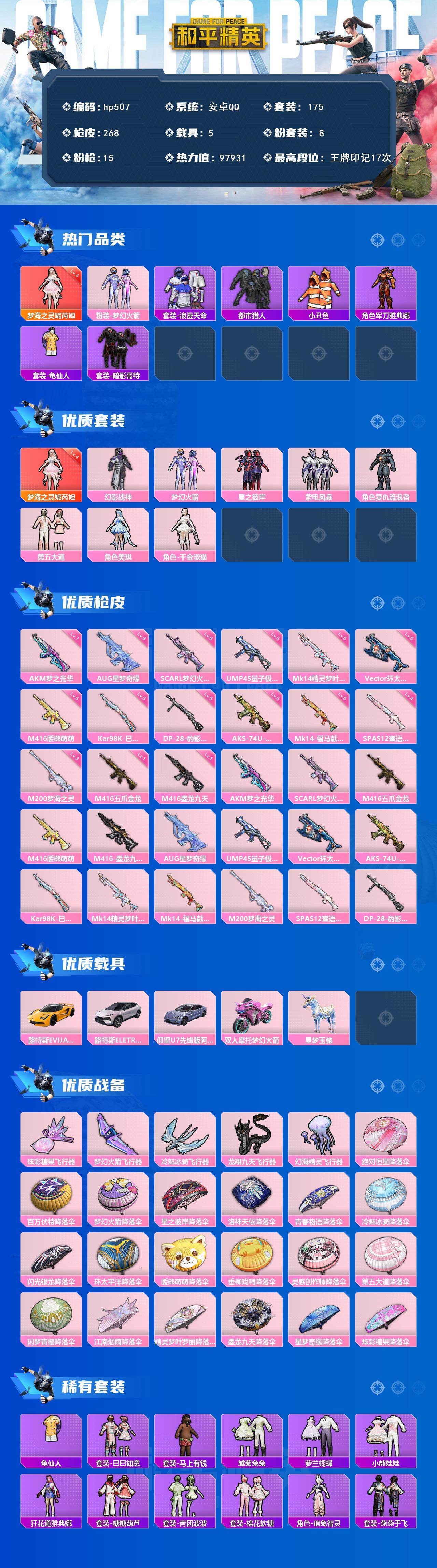 [17262189]安卓 手Q-1神装-8粉装-15特效枪-5载具-5粉色飞行器-97931热力值-17王牌印记-175套装-268枪皮 【红色神装等级】:梦海之灵-妮芮妲(四级) 【红色角色神装】:梦海之灵-妮芮妲 【热门品类】:粉装-梦幻火箭,套装-浪漫天命,套装-都市猎人,套装-小丑鱼,角色-军刀雅典娜,套装-龟仙人,套装-暗影哥特 【粉色套装】:粉装-幻影战神,粉装-梦幻火箭,粉装-星之彼岸,粉装-紫电风暴,角色-复仇流浪者,粉装-第五大道,角色-美琪,角色-千金淑猫 【粉色枪皮等级】:AKM-梦之光华(七级),SCAR-L-梦幻火箭(六级),M416-五爪金龙(一级),M416-暖熊萌萌(五级),M416-墨龙九天(一级),AUG-星梦奇缘(六级),UMP45-量子极限(五级),Vector-环太平洋(五级),AKS-74U-森灵之息(五级),Kar98K-巳巳如意(五级),Mk14-精灵梦叶罗丽(五级),Mk14-福马献瑞(五级),M200-梦海之灵(三级),SPAS-12-蜜语绒猫(四级),DP-28-豹影疾电(五级) 【粉色载具】:路特斯EVIJA(星际黄),路特斯ELETRE(花绽灰),仰望U7(阿盖尔紫),双人摩托-梦幻火箭,星梦玉骢 【粉色枪皮】:AKM-梦之光华,SCAR-L-梦幻火箭,M416-五爪金龙,M416-暖熊萌萌,M416-墨龙九天,AUG-星梦奇缘,UMP45-量子极限,Vector-环太平洋,AKS-74U-森灵之息,Kar98K-巳巳如意,Mk14-精灵梦叶罗丽,Mk14-福马献瑞,M200-梦海之灵,SPAS-12-蜜语绒猫,DP-28-豹影疾电 【粉色飞行器】:炫彩糖果飞行器,梦幻火箭飞行器,冷魅冰骑飞行器,龙翔九天飞行器,幻海精灵飞行器 【粉色降落伞】:绝对恒星降落伞,百万伏特降落伞,梦幻火箭降落伞,星之彼岸降落伞,洛神天依降落伞,青春物语降落伞,冷魅冰骑降落伞,闪光银龙降落伞,环太平洋降落伞,暖熊萌萌降落伞,垂柳戏鸭降落伞,灵感创作师降落伞,第五大道降落伞,闲梦青缨降落伞,江南烟雨降落伞,精灵梦叶罗丽降落伞,墨龙九天降落伞,星梦奇缘降落伞,炫彩糖果降落伞 【稀有套装】:套装-龟仙人,套装-巳巳如意,套装-雪国风尚,套装-炫彩糖果,套装-马上有钱,套装-雏菊兔兔,套装-萝兰蝴蝶,套装-小熊娃娃,角色-狂花道·雅典娜,套装-糖糖葫芦,套装