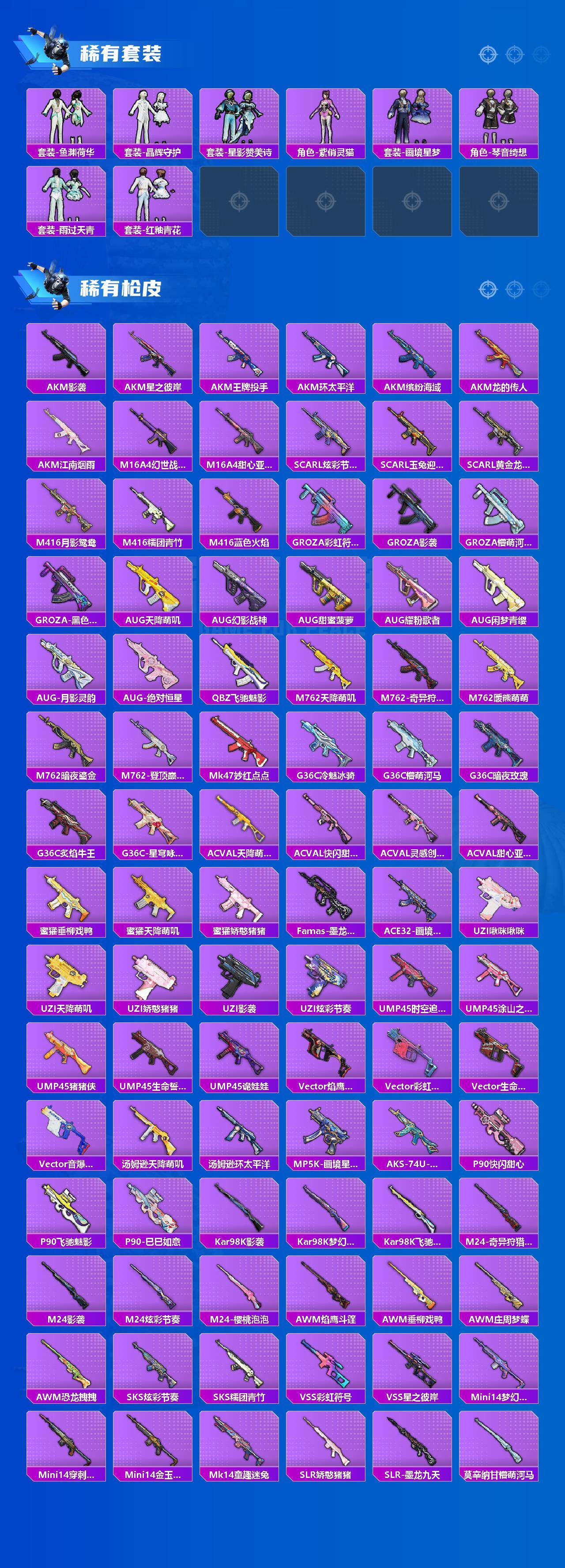 AKM-梦之光华,SCAR-L-梦幻火箭,M416-五爪金龙,M416-暖熊萌萌,M416-墨龙九天,AUG-星梦奇缘,UMP45-量子极限,Vector-环太平洋,Kar98K-巳巳如意,Mk14-精灵梦叶罗丽,M200-梦海之灵,SPAS-12-蜜语绒猫