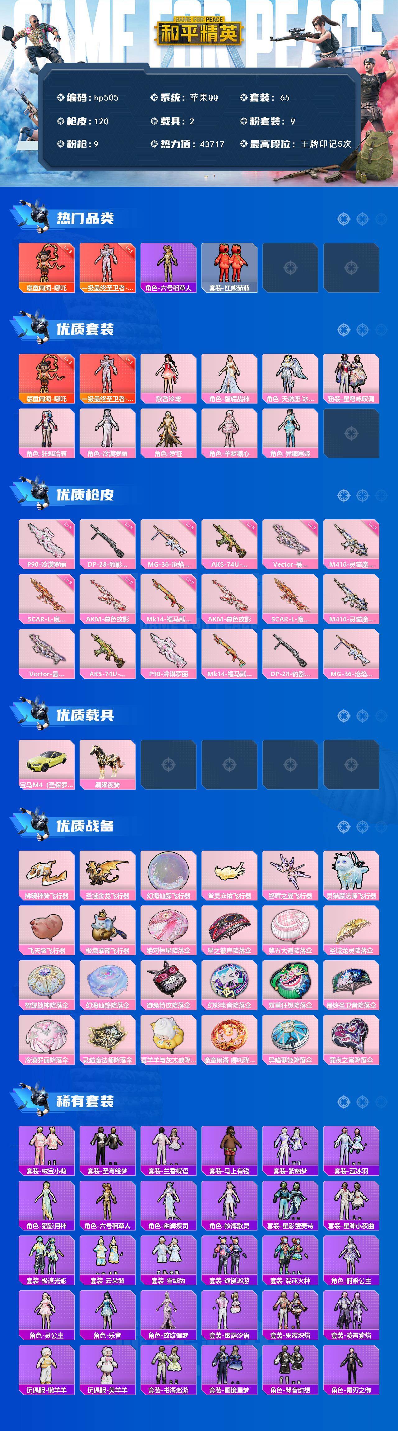 [17262266]苹果 手Q-2神装-9粉装-9特效枪-2载具-9粉色飞行器-43717热力值-5王牌印记-65套装-120枪皮 【红色神装等级】:魔童闹海-哪吒(三级),最终圣卫者-帕修斯(一级) 【红色角色神装】:魔童闹海-哪吒,最终圣卫者-帕修斯 【热门品类】:角色-六号稻草人,套装-红熊茄茄 【粉色套装】:角色-歌者泠鸢,角色-智耀战神,角色-天鹅座 冰河,粉装-星穹咏叹调,角色-狂魅哈莉,角色-冷漠罗丽,角色-罗征,角色-羊梦糖心,角色-异瞳寒姬 【粉色枪皮等级】:AKM-暮色玫影(二级),SCAR-L-魔童闹海 哪吒(三级),M416-灵猫魔法师(三级),Vector-最终圣卫者(三级),AKS-74U-森灵之息(五级),P90-冷漠罗丽(五级),Mk14-福马献瑞(二级),DP-28-豹影疾电(五级),MG-36-沧焰双生(五级) 【粉色载具】:宝马M4(圣保罗黄),黑曜夜骑 【粉色枪皮】:AKM-暮色玫影,SCAR-L-魔童闹海 哪吒,M416-灵猫魔法师,Vector-最终圣卫者,AKS-74U-森灵之息,P90-冷漠罗丽,Mk14-福马献瑞,DP-28-豹影疾电,MG-36-沧焰双生 【粉色飞行器】:拂晓神骑飞行器,圣域金龙飞行器,幻海仙踪飞行器,雀灵庇佑飞行器,终晖之翼飞行器,灵猫魔法师飞行器,飞天猪飞行器,极意拳锋飞行器 【粉色降落伞】:绝对恒星降落伞,星之彼岸降落伞,第五大道降落伞,圣域龙灵降落伞,智耀战神降落伞,幻海仙踪降落伞,御兔特攻降落伞,幻彩电音降落伞,双重狂想降落伞,最终圣卫者降落伞,冷漠罗丽降落伞,灵猫魔法师降落伞,喜羊羊与灰太狼降落伞,魔童闹海 哪吒降落伞,异瞳寒姬降落伞,罪夜之冕降落伞 【稀有套装】:套装-绒宝小鹅,套装-圣穹绘梦,套装-兰香蝶语,套装-雪国风尚,套装-马上有钱,套装-紫幽梦,套装-蓝冰羽,角色-猎影月神,角色-六号稻草人,角色-幽澜祭司,角色-鲛海歌灵,套装-星影赞美诗,套装-星渊小夜曲,套装-极速光影,套装-云朵鹅,套装-雪绒豹,套装-诡诞巡游,套装-混沌火种,角色-时希公主,角色-灵公主,角色-乐音,角色-玫纹锢梦,套装-蜜露汐语,套装-朱霞炽焰,套装-凌霄紫焰,玩偶服-懒羊羊,玩偶服-美羊羊,套装-书海巡游,套装-画境星梦,套装-琴音绮想,角色-霜刃之御 【稀有枪皮】:AKM-破晓战魂,AKM-灵猫魔法师,M16A4