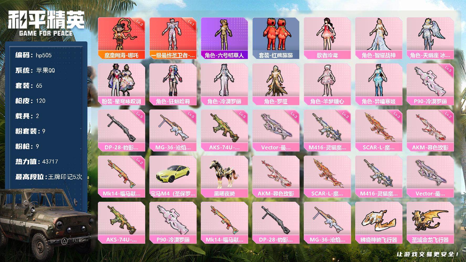 [17262266]苹果 手Q-2神装-9粉装-9特效枪-2载具-9粉色飞行器-43717热力值-5王牌印记-65套装-120枪皮