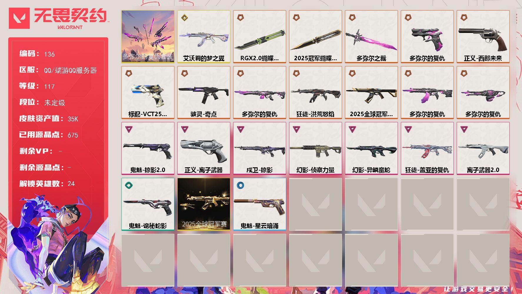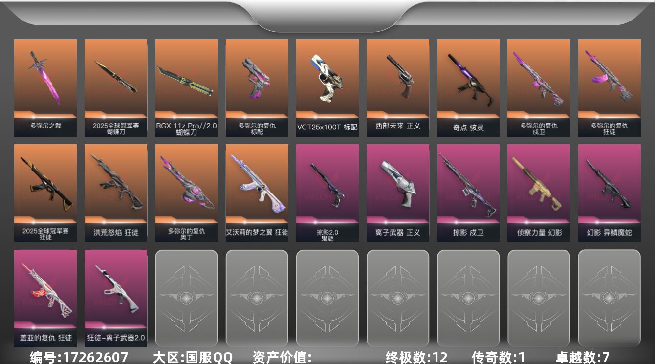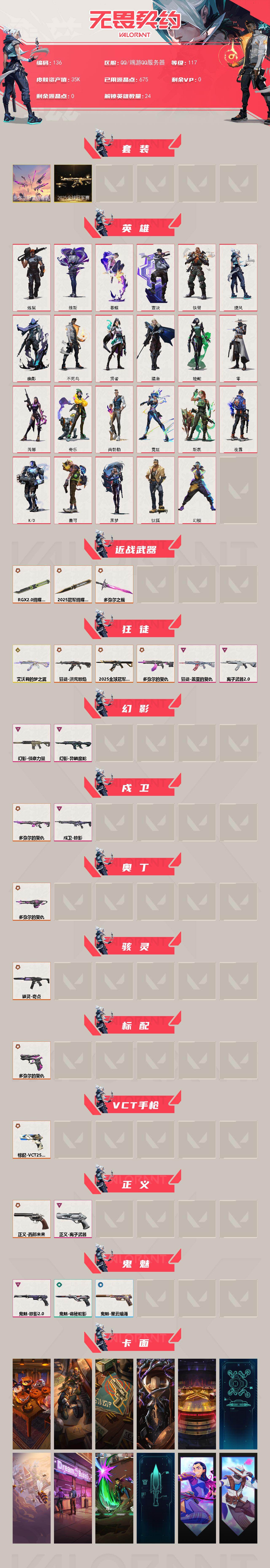 [17262607]【136】【套装】:2025全球冠军赛套装,多弥尔的复仇套装 【英雄】:幻棱,炼狱,维斯,暮蝶,钛狐,壹决,铁臂,捷风,幽影,不死鸟,贤者,猎枭,蝰蛇,零,芮娜,奇乐,尚勃勒,霓虹,斯凯,夜露,K/O,盖可,黑梦 【近战武器】:近战武器-2025全球冠军赛 蝴蝶刀,近战武器-多弥尔之裁,近战武器-RGX 11z Pro//2.0 蝴蝶刀 【狂徒】:狂徒-艾沃莉的梦之翼,狂徒-2025全球冠军赛,狂徒-洪荒怒焰,狂徒-多弥尔的复仇,狂徒-盖亚的复仇,狂徒-离子武器//2.0 【幻影】:幻影-侦察力量,幻影-异鳞魔蛇 【戍卫】:戍卫-多弥尔的复仇,戍卫-掠影 【奥丁】:奥丁-多弥尔的复仇 【骇灵】:骇灵-奇点 【标配】:标配-多弥尔的复仇 【VCT手枪】:标配-VCT25 x 100T 【正义】:正义-西部未来,正义-离子武器 【鬼魅】:鬼魅-掠影//2.0,鬼魅-诡秘蛇影,鬼魅-星云暗涌 【卡面】:南瓜盛典 卡面,修车达人 卡面,正义的化身 卡面,时间到 卡面,最高舞台 卡面,声感陷阱设计图 卡面,采蜜小蜂队 卡面,梦幻奶茶 卡面,源能反应 卡面,零点嗅探设计图 卡面,无畏契约GO!第一卷:芮娜 卡面,无畏契约GO!第一卷:零 卡面,逆向独行 卡面 ,无畏契约GO!第一卷:贤者 卡面,代号红色 卡面,新兵报到 卡面,V契约 卡面,无畏契约 卡面 【喷漆】:控场勿近 喷漆,熊抱 喷漆,超级粉丝 喷漆,捷风差距 喷漆,拼一枪 喷漆,情绪控制 喷漆,买装还是存钱 喷漆,胜利属于无畏契约 喷漆,GLHF 喷漆,无畏契约 喷漆 【挂饰】:第九季//第三幕 纪念币 挂饰,熔岩灯 挂饰,第九季//第二幕 纪念币 挂饰,袖珍捷风 挂饰,迷你浓缩 挂饰,第九季//第一幕 纪念币 挂饰,第八季//第三幕 纪念币 挂饰,天外飞客 挂饰,好运福爪 挂饰,无畏契约 纪念币 挂饰