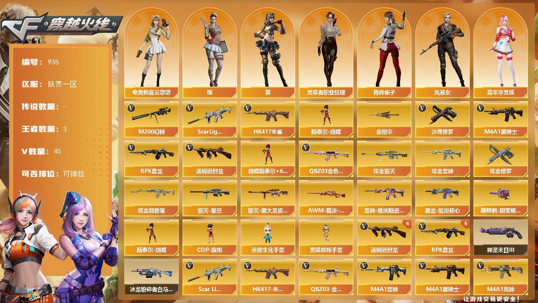 [17263009]陕西一区-45V-3王者-4炫金 【热门武器】:QBZ03-金色蔷薇,Scar Light-白虎,HK417-朱雀,M200-幻神,M4A1-黑骑士,汤姆逊-烈龙*7,RPK-盘龙*6,斯泰尔-蝴蝶,沙鹰-修罗*4,金刚伞 【王者炫金武器】:炫金雷神,炫金超新星,炫金毁灭,炫金修罗 【皮肤】:AWM-裁决-凤灵皮肤,雷神-维纳斯皮肤,毁灭-星空,毁灭-黑大圣皮肤,黑龙-能量核心,麒麟刺-甜蜜糖果 皮肤 【角色】:葵,樱,电竞教官-云悠悠,风暴女*2,嘉年华灵狐,灵狐者-七夕宝贝,灵狐者-职业经理,龙儿-小淘气,麻雀,曼陀罗-礼服,潘多拉-X,青霞仙子,赛斯-X,斯沃特-X,兔囡囡 【人偶武器】:斯泰尔-蝴蝶,COP-旗袍,迷你生化手雷,灵狐娃娃手雷 【挑战大师】:冰龙粉碎者-白马银枪*2,神圣爆裂者-末日III 【英雄级武器】:AK47-火麒麟,M4A1-雷神,M4A1-黑骑士,M4A1-死神,HK417-朱雀,Scar Light-白虎,无影-神兵利器,QBZ03-金色蔷薇,王者之心-觉醒版,王者火魄-觉醒版,Barrett-毁灭,M200-幻神,RPK-盘龙*6,炼狱-悦蓝-觉醒版,汤姆逊-烈龙*7,沙鹰-修罗*4,屠龙,擎天,麒麟刺,高爆手雷-竞技荣光*4,闪光弹-竞技荣光*4,烟雾弹-竞技荣光*4 【道具】:背包-葫芦兄弟,黄金生化钩,生化弹匣,夺命之镰,防化服,金色流光-枪王排位*2,斯沃特表情,EP战队名片,C4-沙漠,防弹头盔,防弹衣,C4工具钳,手雷包 【特殊枪械】:蝴蝶斯泰尔+6烈龙,1白虎,1黑骑士,6烈龙,6盘龙,1蝴蝶斯泰尔