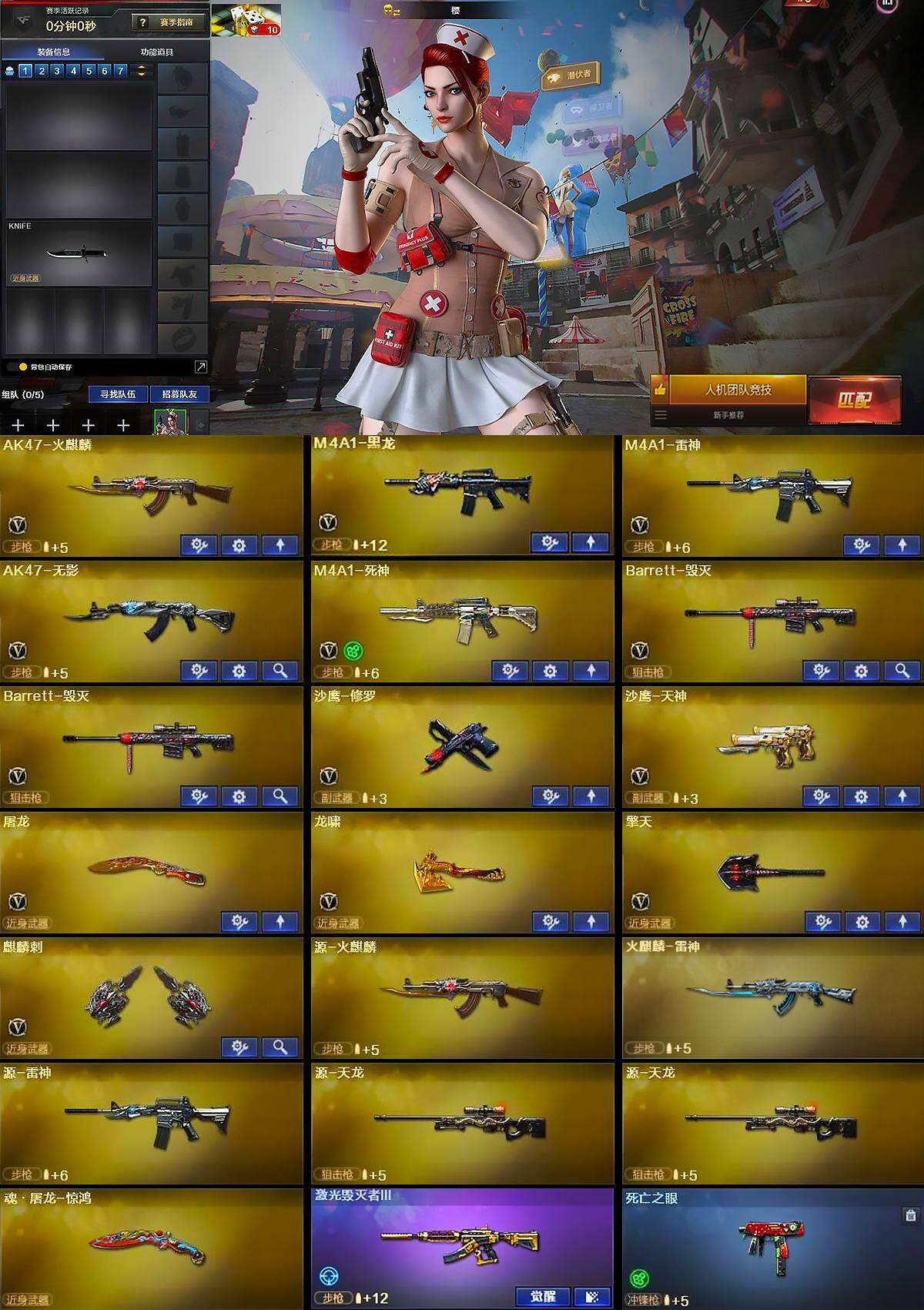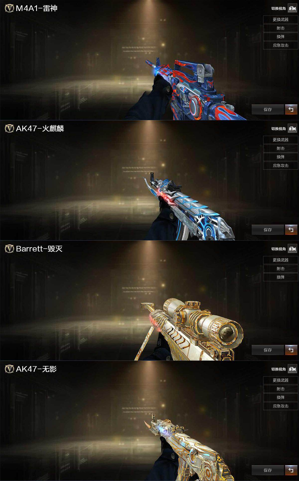 【英雄级武器】:AK47-火麒麟,M4A1-黑龙,M4A1-雷神,AK47-无影,M4A1-死神,Barrett-毁灭*2,沙鹰-修罗,沙鹰-天神,屠龙,龙啸,擎天,麒麟刺