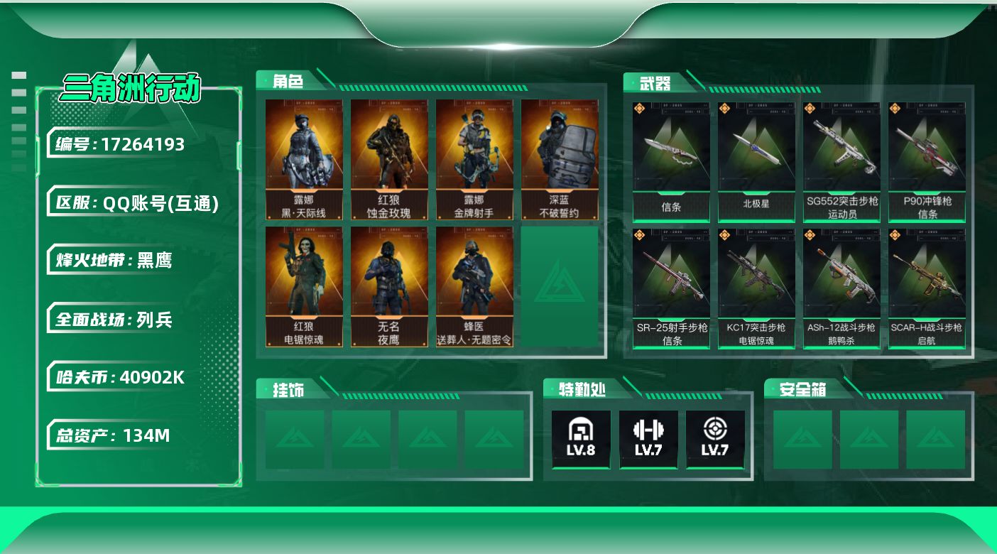 [17264193]134m总资产-40902k哈伏币-60烽火等级-黑鹰-15战场等级-列兵 【干员外观】:红狼-蚀金玫瑰,露娜-黑·天际线,蜂医-送葬人·无题密令,无名-夜鹰,深蓝-不破誓约,红狼-电锯惊魂,露娜-金牌射手 【近战皮肤】:近战-北极星,近战-信条,近战-黑鹰 【传说外观】:M4A1突击步枪-蚀金玫瑰,M4A1突击步枪-阿米娅,ASh-12战斗步枪-鹅鸭杀,SG552突击步枪-运动员,AK-12突击步枪-夜鹰,AK-12突击步枪-特斯拉线圈,SCAR-H战斗步枪-水墨云图,SCAR-H战斗步枪-启航,CAR-15突击步枪-阿米娅,腾龙突击步枪-捞点薯条,K437突击步枪-北极星,KC17突击步枪-电锯惊魂,P90冲锋枪-信条,UZI冲锋枪-特斯拉线圈,SMG-45冲锋枪-骑士,SR-3M紧凑突击步枪-特斯拉线圈,勇士冲锋枪-能天使-午夜邮差,QCQ171冲锋枪-北极星,QCQ171冲锋枪-鹅鸭杀,725双管霰弹枪-送葬人-无题密令,M250通用机枪-骑士之心,QJB201轻机枪-鹅鸭杀,SR-25射手步枪-信条,R93狙击步枪-维什戴尔,AWM狙击步枪-捞点薯条,93R-捞点薯条,复合弓-黑·天际线 【史诗外观】:AKM突击步枪-林中猎手,QBZ95-1突击步枪-曙光,ASh-12战斗步枪-守夜人,ASh-12战斗步枪-无极限,M16A4突击步枪-竞赛选手,AUG突击步枪-战术迷彩,AUG突击步枪-蝮蛇,M7战斗步枪-百步穿杨,SG552突击步枪-尖端治疗,SG552突击步枪-深海恐惧,SCAR-H战斗步枪-囚徒,G3战斗步枪-流沙送葬,AS Val突击步枪-尖端治疗,AS Val突击步枪-典狱官,AS Val突击步枪-百步穿杨,腾龙突击步枪-无垢,腾龙突击步枪-猎鳄行动,K437突击步枪-守护者,MP5冲锋枪-深海恐惧,MP5冲锋枪-战术竞备,MP5冲锋枪-竞技风,Vector冲锋枪-阿萨拉文明,Vector冲锋枪-百步穿杨,Vector冲锋枪-异域战争,SR-3M紧凑突击步枪-荒野求生,SR-3M紧凑突击步枪-战术竞备,勇士冲锋枪-深海恐惧,勇士冲锋枪-工业狂潮,MP7冲锋枪-无垢,MP7冲锋枪-守护者,M1014霰弹枪-林中猎手,S12K霰弹枪-曙光,PKM通用机枪-蝮蛇,PKM通用机枪-守夜人,PKM通用机枪-荒野求生,M250通用机枪-囚徒,Mini-14
