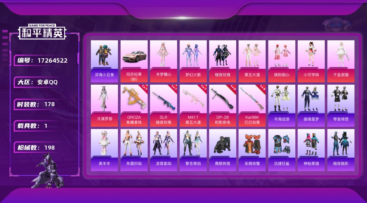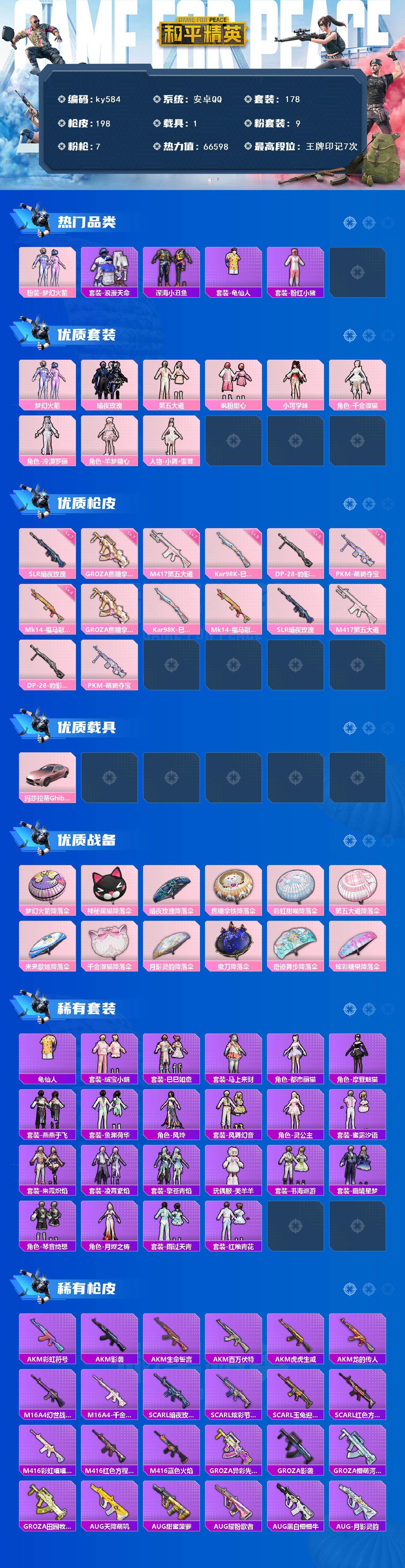 [17264522]安卓 手Q-9粉装-7特效枪-1载具-0粉色飞行器-66598热力值-7王牌印记-178套装-198枪皮 【热门品类】:粉装-梦幻火箭,套装-浪漫天命,套装-深海小丑鱼,套装-龟仙人,套装-粉红小猪 【粉色套装】:粉装-梦幻火箭,粉装-暗夜玫瑰,粉装-第五大道,粉装-飒粉甜心,角色-小可学妹,角色-千金淑猫,角色-冷漠罗丽,角色-羊梦糖心,人物-小舞·雪昙 【粉色枪皮等级】:GROZA-焦糖拿铁(七级),Kar98K-巳巳如意(五级),Mk14-福马献瑞(四级),SLR-暗夜玫瑰(七级),M417-第五大道(七级),DP-28-豹影疾电(五级),PKM-萌骑夺宝(五级) 【粉色载具】:玛莎拉蒂Ghibli(粉) 【粉色枪皮】:GROZA-焦糖拿铁,Kar98K-巳巳如意,Mk14-福马献瑞,SLR-暗夜玫瑰,M417-第五大道,DP-28-豹影疾电,PKM-萌骑夺宝 【粉色降落伞】:梦幻火箭降落伞,神秘黑猫降落伞,暗夜玫瑰降落伞,焦糖拿铁降落伞,彩虹甜喵降落伞,第五大道降落伞,未来歌姬降落伞,千金淑猫降落伞,月影灵韵降落伞,鬼刀降落伞,奇迹舞步降落伞,炫彩糖果降落伞 【稀有套装】:套装-龟仙人,套装-绒宝小鹅,套装-巳巳如意,套装-雪国风尚,套装-马上来财,角色-都市丽猫,角色-摩登魅猫,套装-燕燕于飞,套装-鱼渊荷华,角色-风玲,套装-风舞幻音,角色-灵公主,套装-蜜露汐语,套装-朱霞炽焰,套装-凌霄紫焰,套装-擎苍青焰,玩偶服-美羊羊,套装-书海巡游,套装-画境星梦,套装-琴音绮想,角色-月烬之祷,套装-雨过天青,套装-红釉青花 【稀有枪皮】:AKM-彩虹符号,AKM-影袭,AKM-生命誓言,AKM-百万伏特,AKM-虎虎生威,AKM-龙的传人,M16A4-幻世战舞者,M16A4-千金淑猫,SCAR-L-暗夜玫瑰,SCAR-L-炫彩节奏,SCAR-L-玉兔迎春,SCAR-L-红色方程式,M416-彩虹嘻嘻猴,M416-红色方程式,M416-蓝色火焰,GROZA-异彩先驱,GROZA-影袭,GROZA-懵萌河马,GROZA-田园牧歌,AUG-天降萌叽,AUG-甜蜜菠萝,AUG-耀粉歌者,AUG-黑白懵懵牛,AUG-月影灵韵,QBZ-彩虹符号,M762-天降萌叽,M762-深海曼妙,M762-瑞龙福将,M762-第五大道,Mk47-妙红点点,G36C-懵萌河马,G