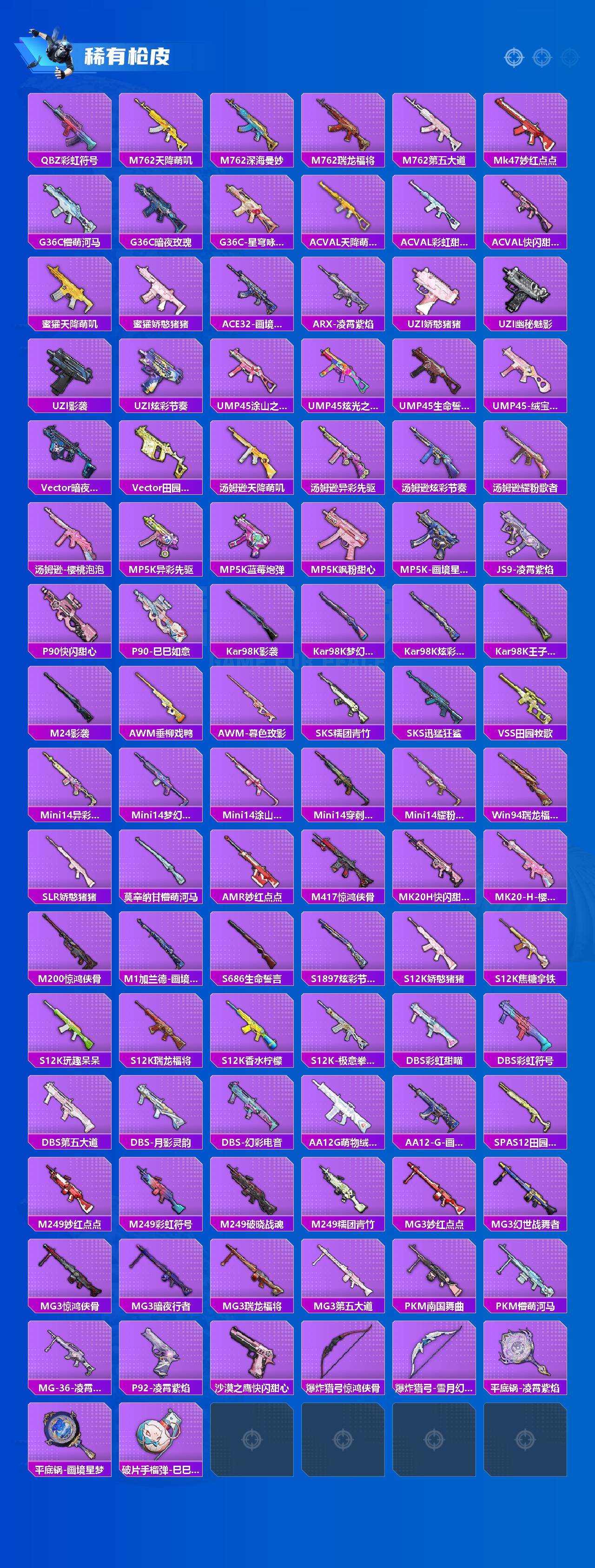 【稀有枪皮】:AKM-彩虹符号,AKM-影袭,AKM-生命誓言,AKM-百万伏特,AKM-虎虎生威,AKM-龙的传人,M16A4-幻世战舞者,M16A4-千金淑猫,SCAR-L-暗夜玫瑰,SCAR-L-炫彩节奏,SCAR-L-玉兔迎春,SCAR-L-红色方程式,M416-彩虹嘻嘻猴,M416-红色方程式,M416-蓝色火焰,GROZA-异彩先驱,GROZA-影袭,GROZA-懵萌河马,GROZA-田园牧歌,AUG-天降萌叽,AUG-甜蜜菠萝,AUG-耀粉歌者,AUG-黑白懵懵牛,AUG-月影灵韵,QBZ-彩虹符号,M762-天降萌叽,M762-深海曼妙,M762-瑞龙福将,M762-第五大道,Mk47-妙红点点,G36C-懵萌河马,G