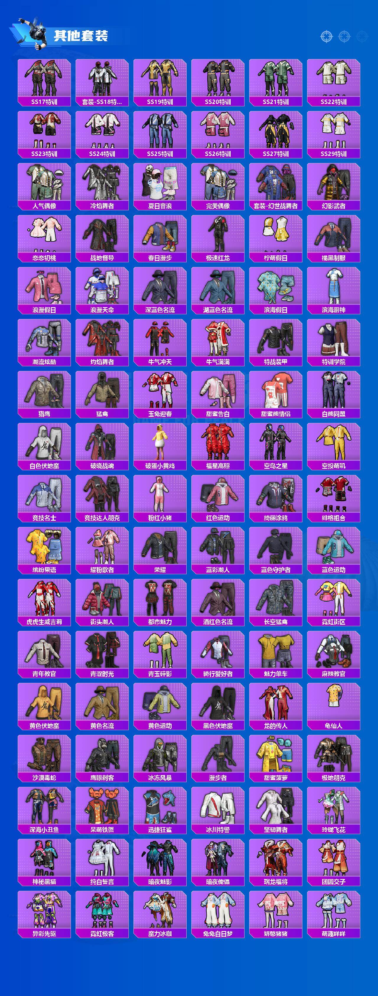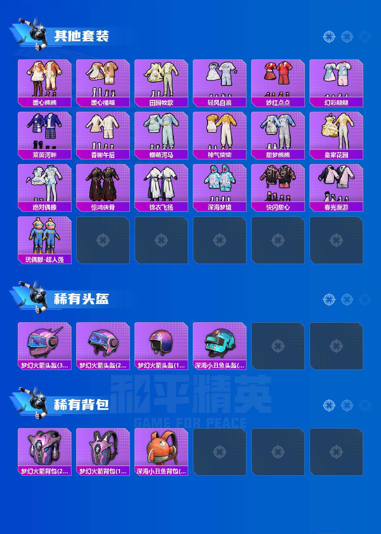 套装-梦幻火箭,套装-深海小丑鱼,套装-暗夜玫瑰,套装-第五大道,套装-飒粉甜心,角色-小可学妹,角色-千金淑猫,套装-鹰眼刺客,套装-呆萌铁蟹,套装-迅捷狂鲨,套装-神秘黑猫,兔兔白日梦套装