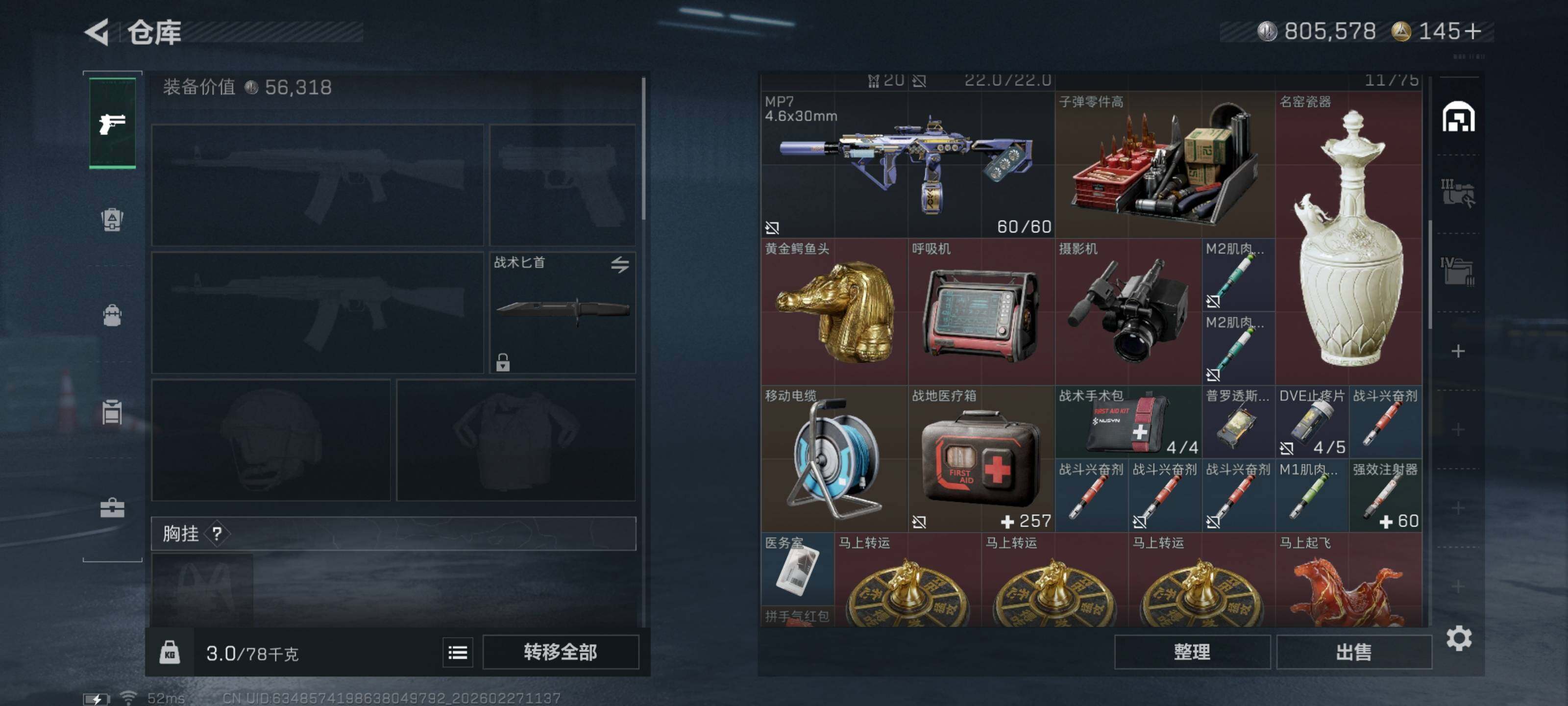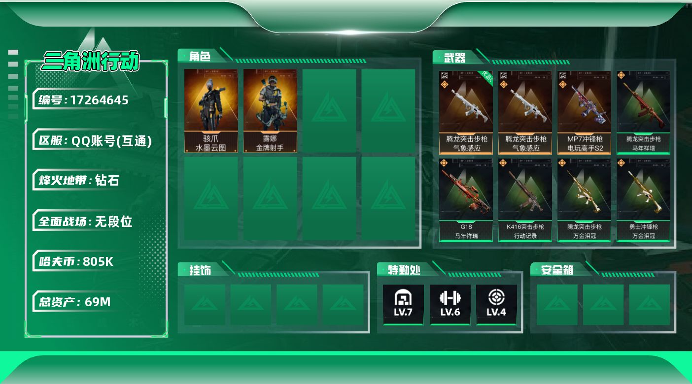 [17264645]二典藏枪皮【特价出售/店主推荐】69m总资产-805k哈伏币-60烽火等级-钻石-1战场等级-无军衔 【干员外观】:骇爪-水墨云图,露娜-金牌射手 【近战皮肤】:近战-黑鹰 【典藏外观】:腾龙突击步枪-气象感应,MP7冲锋枪-电玩高手S2 【典藏外观成色】:腾龙突击步枪-气象感应(优品C),MP7冲锋枪-电玩高手S2(优品C) 【传说外观】:K416突击步枪-行动记录,SG552突击步枪-运动员,SCAR-H战斗步枪-水墨云图,SCAR-H战斗步枪-启航,腾龙突击步枪-马年祥瑞,腾龙突击步枪-万金泪冠,勇士冲锋枪-万金泪冠,M14射手步枪-蛮荒,M14射手步枪-缄花,SR-25射手步枪-缄花,AWM狙击步枪-万金泪冠,.357左轮-缄花,G18-马年祥瑞 【史诗外观】:QBZ95-1突击步枪-曙光,K416突击步枪-腊梅,AUG突击步枪-蝮蛇,M7战斗步枪-百步穿杨,SCAR-H战斗步枪-囚徒,G3战斗步枪-流沙送葬,AS Val突击步枪-百步穿杨,Vector冲锋枪-百步穿杨,SMG-45冲锋枪-阿萨拉特攻,MP7冲锋枪-六套之力,PKM通用机枪-蝮蛇,M249轻机枪-丛影谍踪,QJB201轻机枪-炽焰,VSS射手步枪-丛影谍踪,M14射手步枪-工业狂潮,M700狙击步枪-竞技风,M700狙击步枪-百步穿杨,AWM狙击步枪-流沙送葬 【稀有外观】:M4A1突击步枪-繁盛,ASh-12战斗步枪-繁盛,K416突击步枪-一帆风顺,M7战斗步枪-捣蛋鬼,SG552突击步枪-马年新春,SG552突击步枪-贴花艺术,G3战斗步枪-主宰,CAR-15突击步枪-来财,K437突击步枪-生存指令,KC17突击步枪-来财,MK47突击步枪-精英联盟,MP5冲锋枪-弄臣,MP5冲锋枪-哈夫克卫队,Vector冲锋枪-先锋,SMG-45-行动开启,SR-3M紧凑突击步枪-马年新春,勇士冲锋枪-主宰,勇士冲锋枪-冰天雪地,M1014霰弹枪-幻影结构,M249轻机枪-冰天雪地,QJB201轻机枪-哈夫克卫队,Mini-14射手步枪-荣耀列队,SR-25射手步枪-开拓,PSG-1射手步枪-主宰,SV-98狙击步枪-星链科技,SV-98狙击步枪-哈夫克航天,SV-98狙击步枪-精英联盟 【普通外观】:M7战斗步枪-噬菌体,G18-彩墨涂鸦,M4A1突击步枪-粉色涂装,M4A1突击步枪-高雅黑