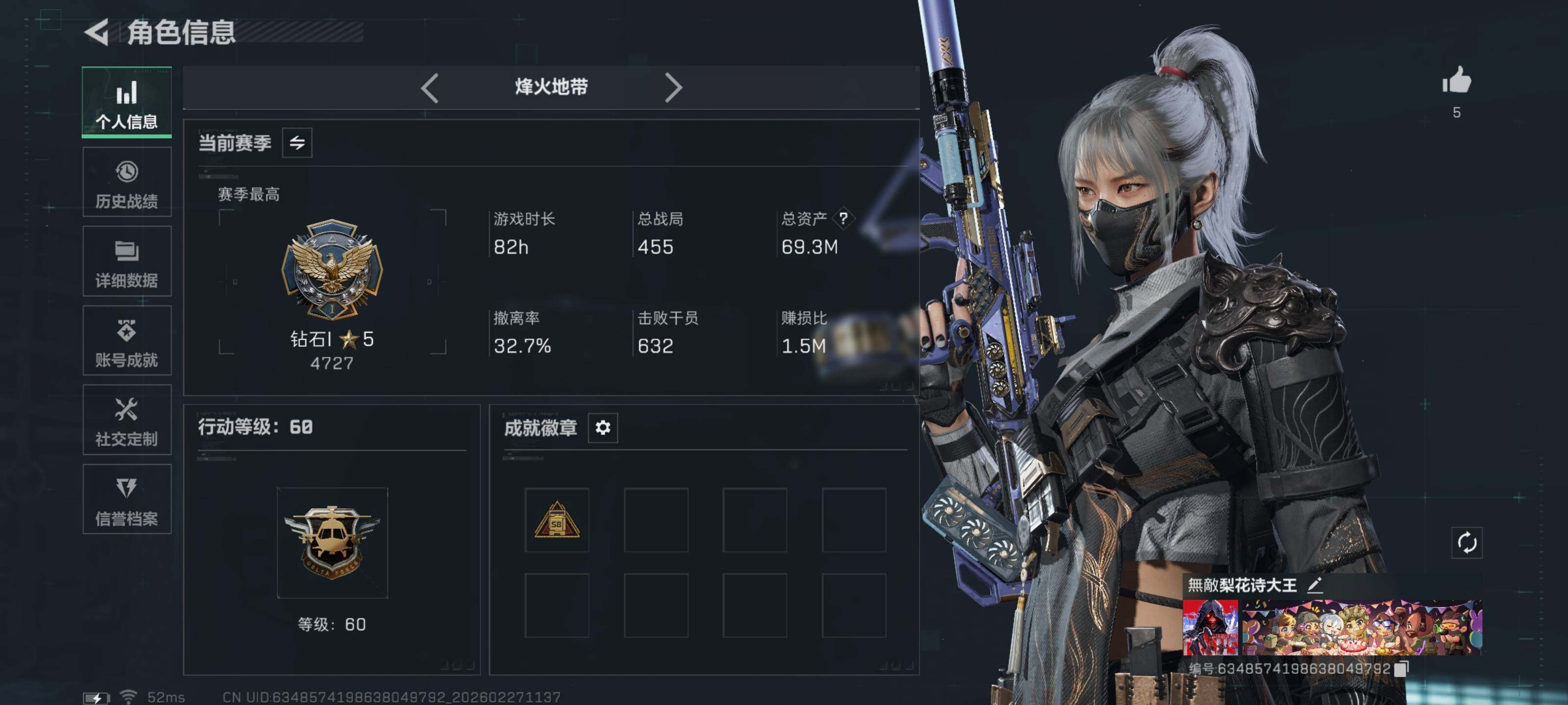 [17264645]二典藏枪皮【特价出售/店主推荐】69m总资产-805k哈伏币-60烽火等级-钻石-1战场等级-无军衔
