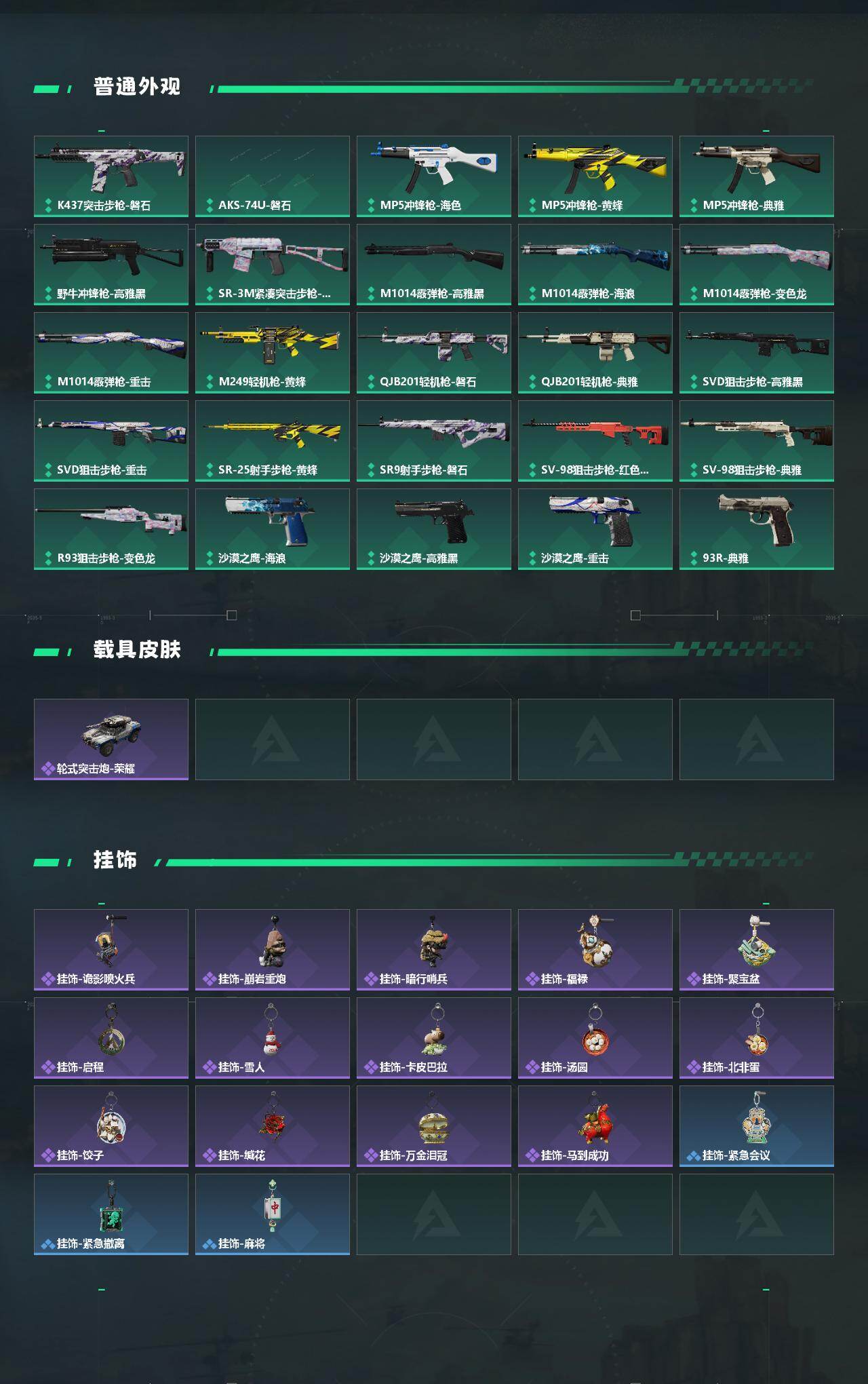 【稀有外观】:M4A1突击步枪-繁盛,ASh-12战斗步枪-繁盛,K416突击步枪-一帆风顺,M7战斗步枪-捣蛋鬼,SG552突击步枪-马年新春,SG552突击步枪-贴花艺术,G3战斗步枪-主宰,CAR-15突击步枪-来财,K437突击步枪-生存指令,KC17突击步枪-来财,MK47突击步枪-精英联盟,MP5冲锋枪-弄臣,MP5冲锋枪-哈夫克卫队,Vector冲锋枪-先锋,SMG-45-行动开启,SR-3M紧凑突击步枪-马年新春,勇士冲锋枪-主宰,勇士冲锋枪-冰天雪地,M1014霰弹枪-幻影结构,M249轻机枪-冰天雪地,QJB201轻机枪-哈夫克卫队,Mini-14射手步枪-荣耀列队,SR-25射手步枪-开拓,PSG-1射手步枪-主宰,SV-98狙击步枪-星链科技,SV-98狙击步枪-哈夫克航天,SV-98狙击步枪-精英联盟
