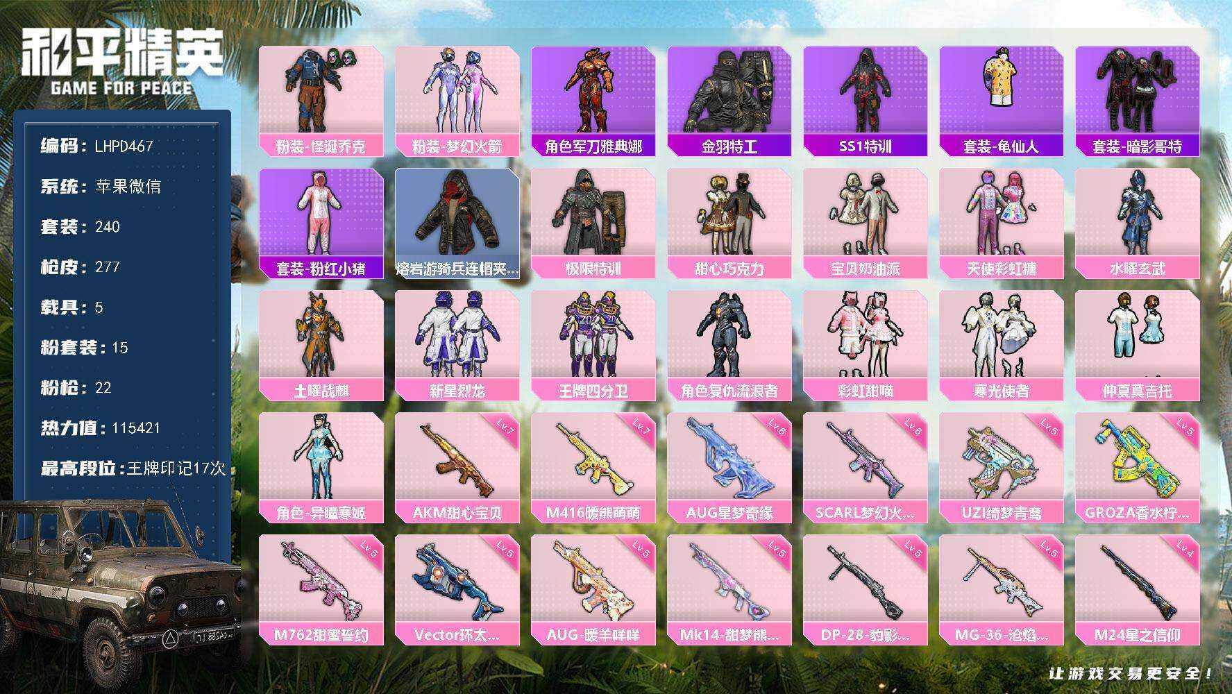 [17264660]地铁满天赋【店主推荐捡漏号!可直接换绑】苹果 微信-15粉装-22特效枪-5载具-5粉色飞行器-115421热力值-17王牌印记-240套装-277枪皮【热门品类】:粉装-怪诞乔克,粉装-梦幻火箭,角色-军刀雅典娜,套装-金羽特工,套装-SS1特训,套装-龟仙人,套装-暗影哥特,套装-粉红小猪,熔岩游骑兵连帽夹克【粉色套装】:粉装-极限特训,粉装-怪诞乔克,粉装-甜心巧克力,粉装-宝贝奶油派,粉装-天使彩虹糖,粉装-水曜玄武,粉装-土曜战麒,粉装-梦幻火箭,粉装-新星烈龙,粉装-王牌四分卫,角色-复仇流浪者,粉装-彩虹甜喵,粉装-寒光使者,粉装-仲夏莫吉托,角色-异瞳寒姬【粉色枪皮等级】:AKM-甜心宝贝(七级),SCAR-L-梦幻火箭(六级),SCAR-L-纯梦嫁纱(一级),M416-五爪金龙(一级),M416-暖熊萌萌(七级),GROZA-香水柠檬(五级),AUG-星梦奇缘(六级),AUG-暖羊咩咩(五级),M762-甜蜜誓约(五级),UZI-绮梦青鸾(五级),UMP45-萌骑冒险(三级),Vector-环太平洋(五级),AKS-74U-无垠阁(三级),Kar98K-巳巳如意(四级),M24-星之信仰(四级),Mini14-荧光虫舞(三级),Mk14-甜梦熊击(五级),Mk14-福马献瑞(一级),M249-彩虹甜喵(四级),DP-28-豹影疾电(五级),MG-36-沧焰双生(五级),平底锅-仲夏莫吉托(二级)【粉色载具】:兰博基尼Aventador SVJ(翡翠绿),阿斯顿马丁DBX(橙),玛莎拉蒂Ghibli(蓝),合金龙骨(蓝),双人摩托-梦幻火箭【粉色枪皮】:AKM-甜心宝贝,SCAR-L-梦幻火箭,SCAR-L-纯梦嫁纱,M416-五爪金龙,M416-暖熊萌萌,GROZA-香水柠檬,AUG-星梦奇缘,AUG-暖羊咩咩,M762-甜蜜誓约,UZI-绮梦青鸾,UMP45-萌骑冒险,Vector-环太平洋,AKS-74U-无垠阁,Kar98K-巳巳如意,M24-星之信仰,Mini14-荧光虫舞,Mk14-甜梦熊击,Mk14-福马献瑞,M249-彩虹甜喵,DP-28-豹影疾电,MG-36-沧焰双生,平底锅-仲夏莫吉托【粉色飞行器】:炫彩糖果飞行器,梦幻火箭飞行器,绮梦青鸾飞行器