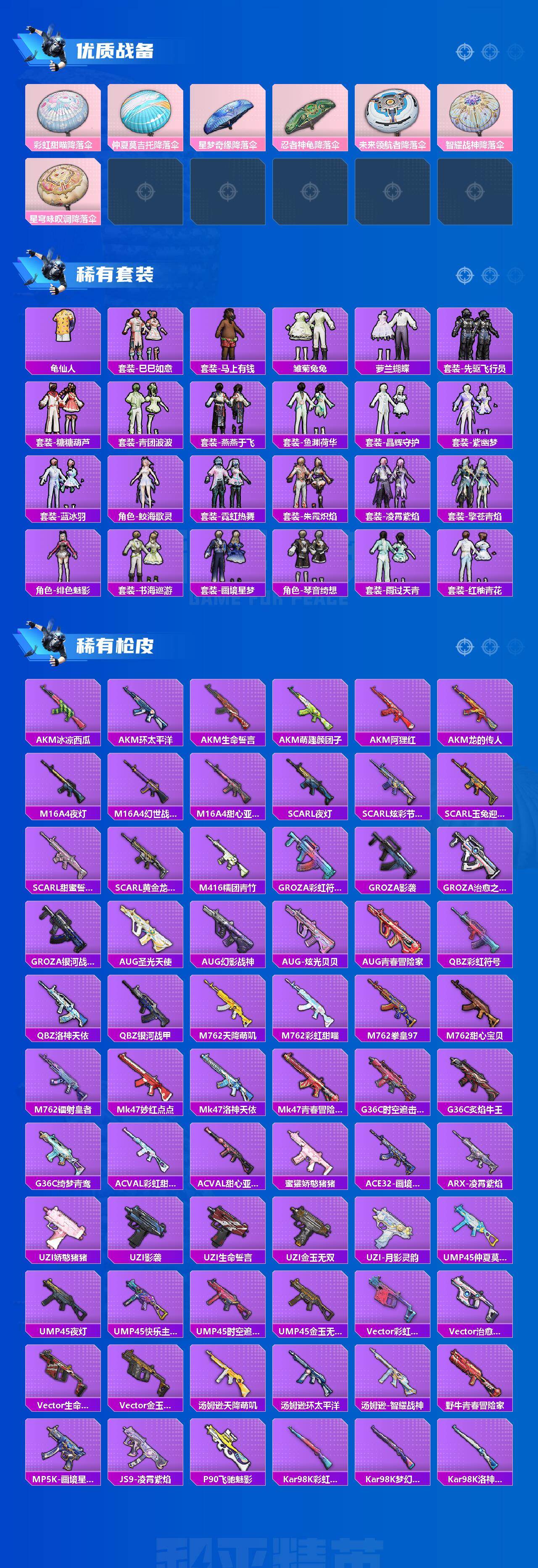 - [16331926]【特价出售/店主推荐】 苹果 手Q-1神装-18粉装-21特效枪-2载具-9粉色飞行器-100267热力值-10王牌印记-184套装-297枪皮【红色神装等级】:辉羽雀灵-初翊(二级)【红色角色神装】:辉羽雀灵-初翊【热门品类】:套装-浪漫天命,套装-赤蝎幽灵,套装-都市猎人,套装-深海小丑鱼,套装-小丑鱼,套装-奇异狩猎者,套装-龟仙人,套装-暗影哥特,套装-红红火火,角色-8号机,角色-Mark.06,角色-六号稻草人【粉色套装】:粉装-甜心巧克力,粉装-宝贝奶油派,粉装-天使彩虹糖,粉装-放客神游,粉装-新星烈龙,粉装-岚岚物语,粉装-千面幻镜,粉装-炫光之旅,角色-蔷薇星,粉装-莲影清波,角色-圣堂之誓,粉装-未来领航者,角色-千金淑猫,粉装-星穹咏叹调,粉装-幻彩电音,角色-绯穹魔姬,角色-异瞳寒姬【粉色枪皮等级】:AKM-绿萝繁花(五级),AKM-幽焰骑士(三级),AKM-幻海仙踪(五级),SCAR-L-锦绣绵绵(五级),M416-暖熊萌萌(六级),GROZA-镜光银凌(五级),AUG-暖羊咩咩(五级),UMP45-量子极限(五级),AKS-74U-信仰神谕(一级),AKS-74U-星穹咏叹调(五级),P90-粉樱探戈(五级),Kar98K-巳巳如意(五级),M24-莲影清波(四级),Mk14-甜梦熊击(五级),AMR-炫光之旅(五级),DP-28-豹影疾电(五级),MG3-辉羽雀灵(三级),MG-36-幻彩电音(四级),烟雾弹-电雾迷城(四级),破片手榴弹-瓶中星球(一级),破片手榴弹-美味星星糖(六级)【粉色载具】:黑曜夜骑,辉羽雀灵自行车【粉色枪皮】:AKM-绿萝繁花,AKM-幽焰骑士,AKM-幻海仙踪,SCAR-L-锦绣绵绵,M416-暖熊萌萌,GROZA-镜光银凌,AUG-暖羊咩咩,UMP45-量子极限,AKS-74U-信仰神谕,AKS-74U-星穹咏叹调,P90-粉樱探戈,Kar98K-巳巳如意,M24-莲影清波,Mk14-甜梦熊击,AMR-炫光之旅,DP-28-豹影疾电,MG3-辉羽雀灵,MG-36-幻彩电音,烟雾弹-电雾迷城,破片手榴弹-瓶中星球,破片手榴弹-美味星星糖【粉色飞行器】:齐天大圣飞行器,沙丘之主天马,花傲天飞行器,幽焰列车飞行器,雀灵庇佑飞行器,终晖之翼飞行器,灵猫魔法师飞行器,飞天猪飞行器