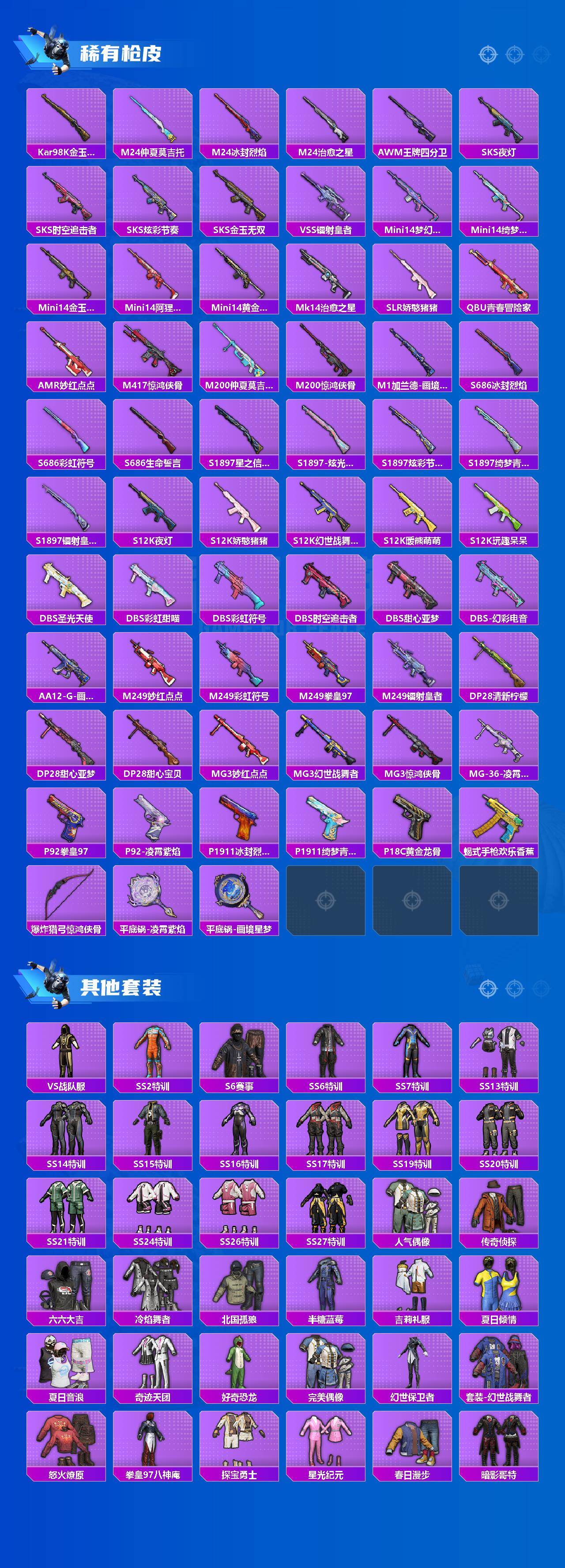 - [17054176]【店主推荐捡漏号!可直接换绑】39388k哈伏币-183m流动资产-60烽火等级-青铜-1战场等级-无军衔 资产212m【干员外观】:红狼-电锯惊魂 【近战皮肤】:近战-黑鹰 【传说外观】:SG552突击步枪-运动员,SCAR-H战斗步枪-启航,KC17突击步枪-电锯惊魂 【史诗外观】:QBZ95-1突击步枪-曙光,G3战斗步枪-流沙送葬,AS Val突击步枪-百步穿杨,Vector冲锋枪-百步穿杨,Vector冲锋枪-异域战争,M250通用机枪-囚徒,SV-98狙击步枪-囚徒,M700狙击步枪-百步穿杨,AWM狙击步枪-流沙送葬 【稀有外观】:AUG突击步枪-旧梦,M4A1突击步枪-繁盛,ASh-12战斗步枪-繁盛,M7战斗步枪-捣蛋鬼,腾龙突击步枪-冰天雪地,MP5冲锋枪-弄臣,MP5冲锋枪-哈夫克卫队,Vector冲锋枪-先锋,UZI冲锋枪-亚特兰蒂斯,SMG-45-行动开启,SMG-45冲锋枪-幻影结构,勇士冲锋枪-主宰,MP7冲锋枪-前沿科技,MP7冲锋枪-钢铁之躯,QJB201轻机枪-哈夫克卫队,Mini-14射手步枪-荣耀列队,SKS射手步枪-弄臣,PSG-1射手步枪-主宰,SV-98狙击步枪-星链科技,SV-98狙击步枪-哈夫克航天,SV-98狙击步枪-精英联盟 【普通外观】:腾龙突击步枪-古铜*2,PTR-32突击步枪-噬菌体,M4A1突击步枪-隐秘行动,M4A1突击步枪-海色,QBZ95-1突击步枪-海浪,QBZ95-1突击步枪-海色,M16A4突击步枪-高雅黑,M7战斗步枪-红色涂装,SG552突击步枪-浅蓝涂装,AK-12突击步枪-变色龙,SCAR-H战斗步枪-红色涂装,SCAR-H战斗步枪-数码迷彩,G3战斗步枪-高雅黑,PTR-32突击步枪-黄蜂,CAR-15突击步枪-变色龙,AS Val突击步枪-隐秘行动,K437突击步枪-磐石,野牛冲锋枪-高雅黑,SR-3M紧凑突击步枪-变色龙,M1014霰弹枪-变色龙,M249轻机枪-黄蜂,M250通用机枪-条纹,QJB201轻机枪-磐石,SVD狙击步枪-高雅黑,SR9射手步枪-磐石,R93狙击步枪-变色龙,沙漠之鹰-高雅黑,93R-三角洲力量 【载具外观】:轮式突击炮-荣耀 【军牌】:军牌-永恒,军牌-零号大坝,军牌-幸福国,军牌-信誉优秀 【挂饰】:挂饰-诡影狙击兵,挂饰-诡影喷火兵,挂饰