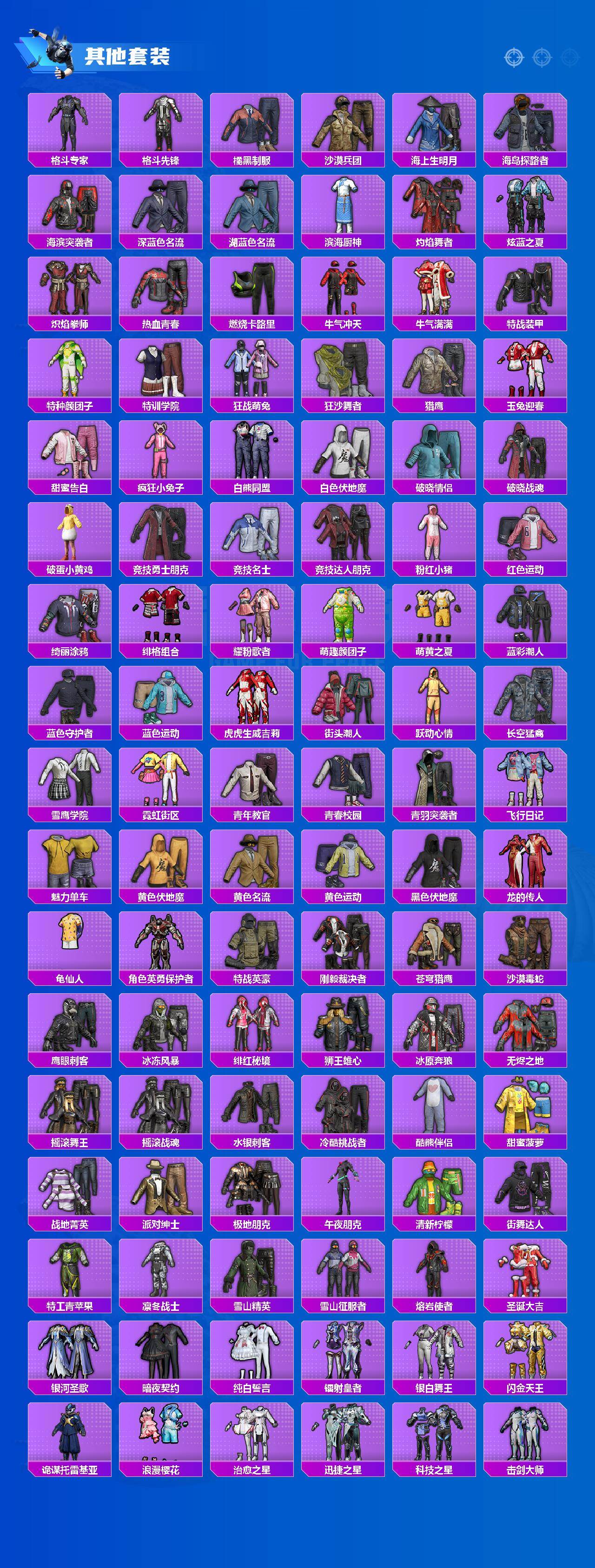 角色-军刀雅典娜,套装-金羽特工,套装-龟仙人,套装-暗影哥特,套装-粉红小猪,套装-狂沙舞者,套装-破蛋小黄鸡,角色-英勇保护者,套装-绯红秘境,套装-水银刺客,套装-雪山精英,套装-暗夜契约,套装-纯白誓言,套装-梦起落英