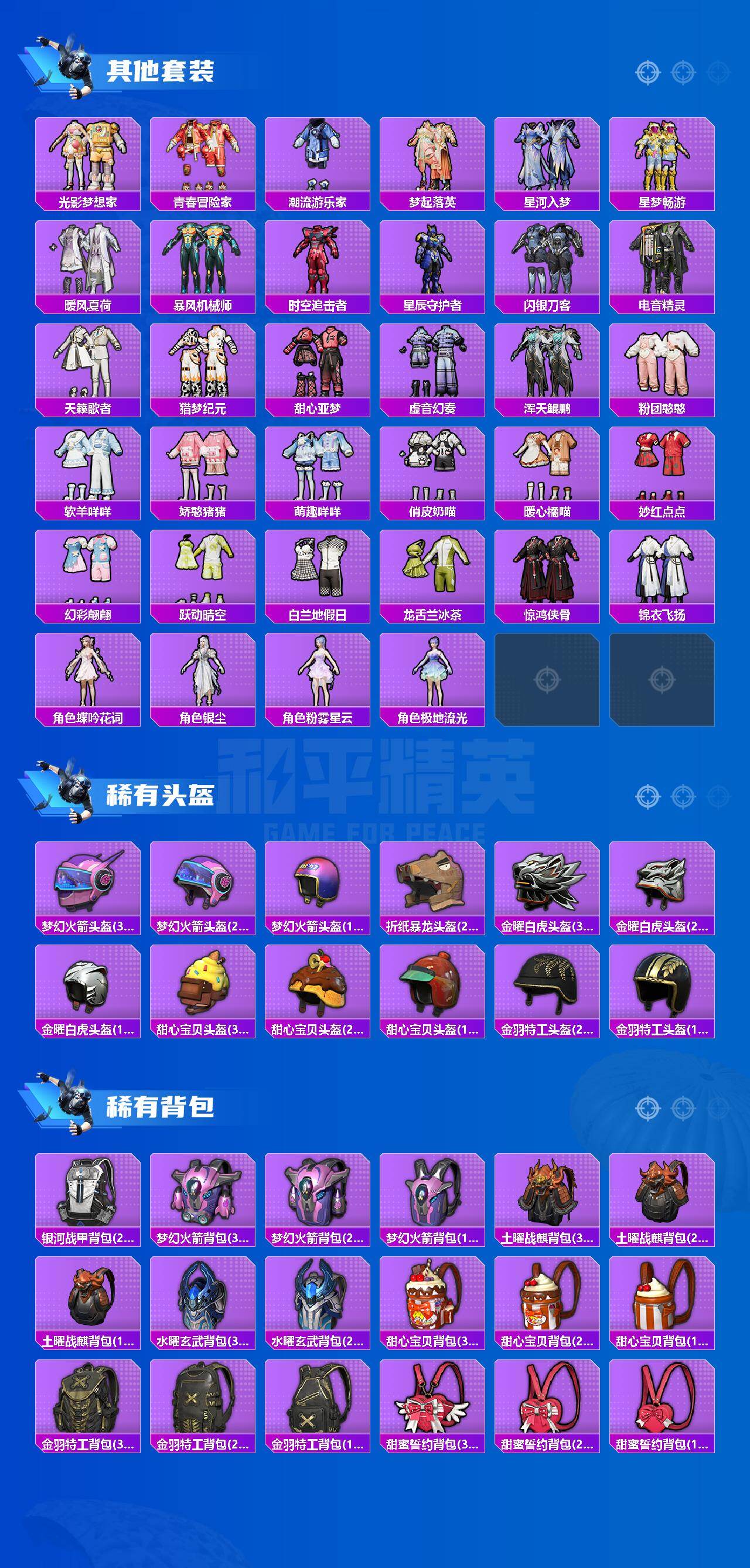 套装-怪诞乔克,套装-梦幻火箭,套装-极限特训,套装-宝贝奶油派,套装-天使彩虹糖,套装-水曜玄武,套装-土曜战麒,套装-新星烈龙,套装-王牌四分卫,角色-复仇流浪者,套装-彩虹甜喵,套装-寒光使者,套装-仲夏莫吉托,奇迹天团套装,好奇恐龙套装,套装-鹰眼刺客,套装-绯红秘境,套装-狮王雄心,酷熊伴侣套装