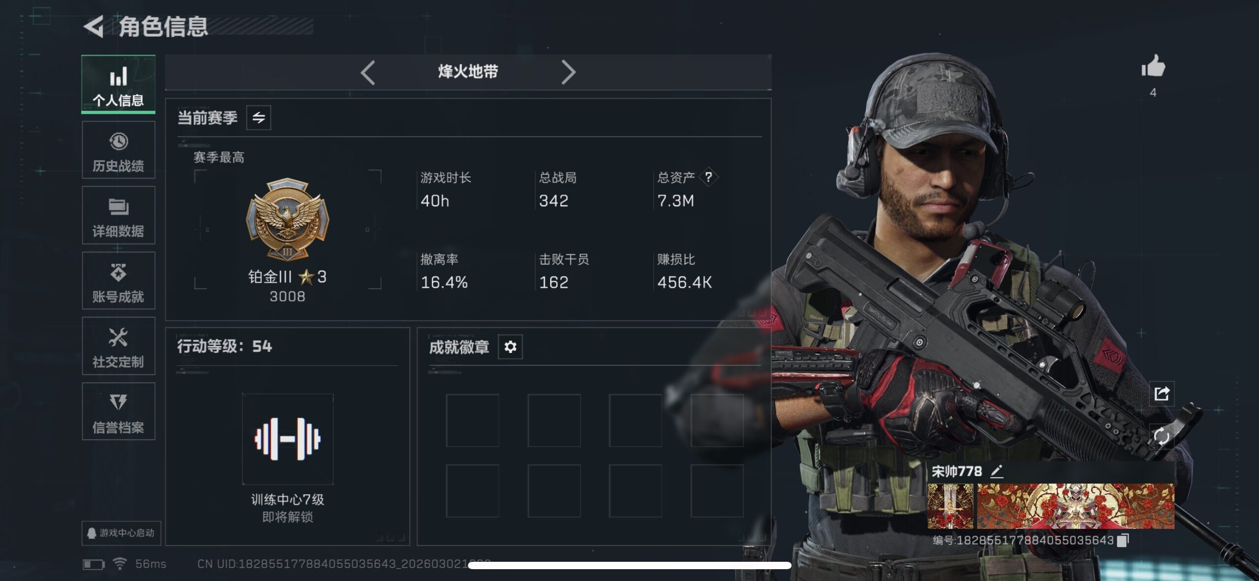 [17265539]【特价出售/店主推荐】7m总资产-84k哈伏币-54烽火等级-铂金-3战场等级-无军衔