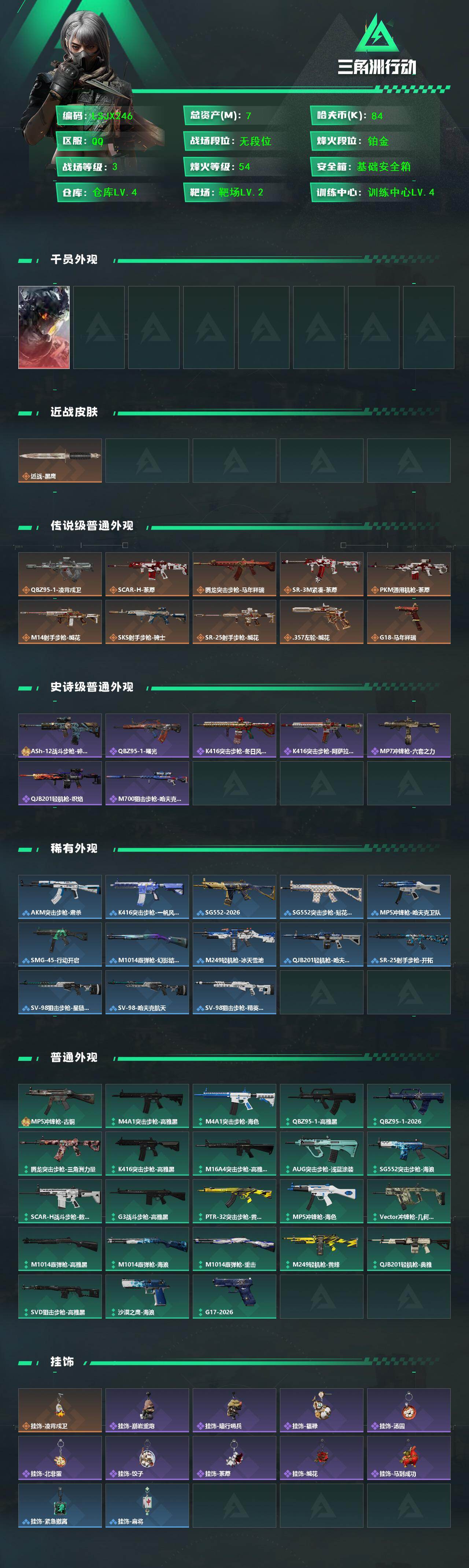 [17265539]【特价出售/店主推荐】7m总资产-84k哈伏币-54烽火等级-铂金-3战场等级-无军衔 【干员外观】:威龙-凌霄戍卫 【近战皮肤】:近战-黑鹰 【传说外观】:QBZ95-1突击步枪-凌霄戍卫,SCAR-H战斗步枪-荼蘼,腾龙突击步枪-马年祥瑞,SR-3M紧凑突击步枪-荼蘼,PKM通用机枪-荼蘼,M14射手步枪-缄花,SKS射手步枪-骑士,SR-25射手步枪-缄花,.357左轮-缄花,G18-马年祥瑞 【史诗外观】:ASh-12战斗步枪-碎冰行动,QBZ95-1突击步枪-曙光,K416突击步枪-冬日风情,K416突击步枪-阿萨拉特攻,MP7冲锋枪-六套之力,QJB201轻机枪-炽焰,M700狙击步枪-哈夫克警备 【稀有外观】:AKM突击步枪-肃杀,K416突击步枪-一帆风顺,SG552突击步枪-2026,SG552突击步枪-贴花艺术,MP5冲锋枪-哈夫克卫队,SMG-45冲锋枪-行动开启,M1014霰弹枪-幻影结构,M249轻机枪-冰天雪地,QJB201轻机枪-哈夫克卫队,SR-25射手步枪-开拓,SV-98狙击步枪-星链科技,SV-98狙击步枪-哈夫克航天,SV-98狙击步枪-精英联盟 【普通外观】:MP5冲锋枪-古铜,M4A1突击步枪-高雅黑,M4A1突击步枪-海色,QBZ95-1突击步枪-高雅黑,QBZ95-1突击步枪-2026,腾龙突击步枪-三角洲力量,K416突击步枪-高雅黑,M16A4突击步枪-高雅黑,AUG突击步枪-浅蓝涂装,SG552突击步枪-海浪,SCAR-H战斗步枪-数码迷彩,G3战斗步枪-高雅黑,PTR-32突击步枪-黄蜂,MP5冲锋枪-海色,Vector冲锋枪-几何迷彩,M1014霰弹枪-高雅黑,M1014霰弹枪-海浪,M1014霰弹枪-重击,M249轻机枪-黄蜂,QJB201轻机枪-典雅,SVD狙击步枪-高雅黑,沙漠之鹰-海浪,G17-2026 【挂饰】:挂饰-凌霄戍卫,挂饰-崩岩重炮*2,挂饰-暗行哨兵*3,挂饰-福禄*2,挂饰-汤圆,挂饰-北非蛋,挂饰-饺子,挂饰-荼蘼,挂饰-缄花,挂饰-马到成功,挂饰-紧急撤离*6,挂饰-麻将*7