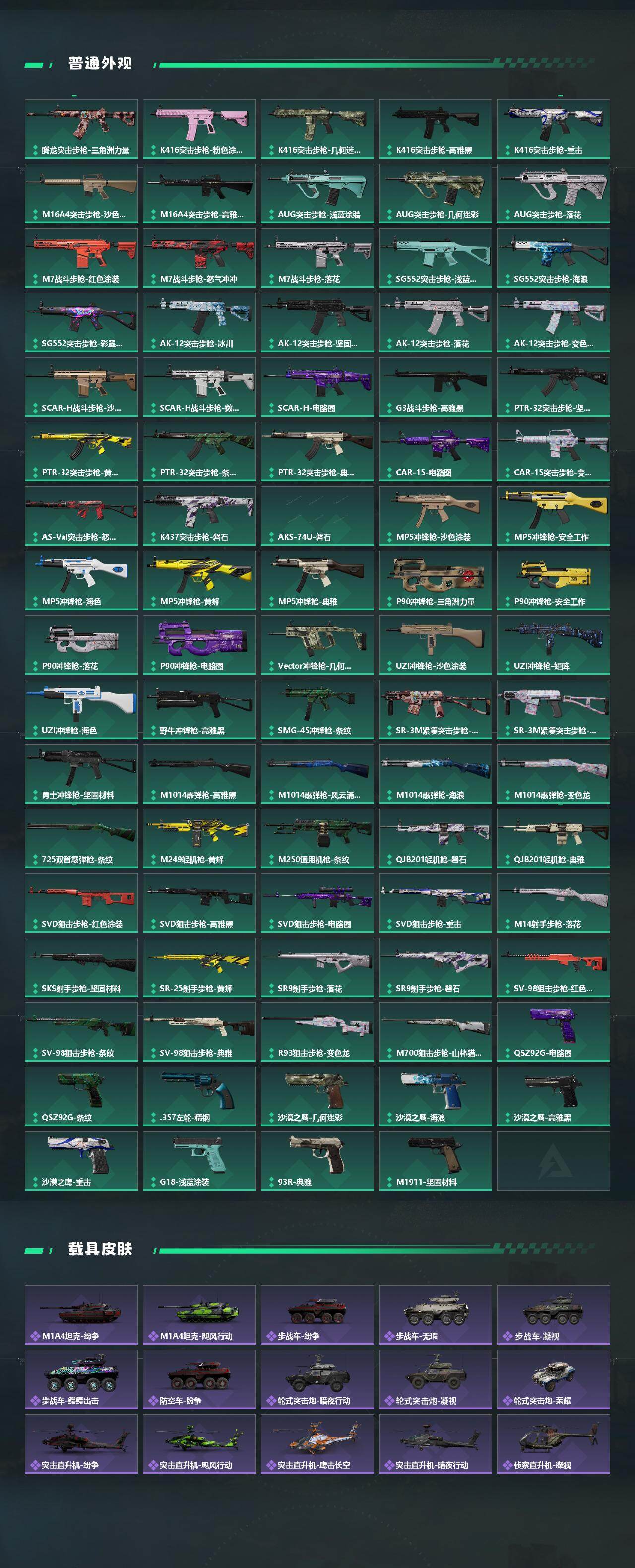 【史诗外观】:SR-25射手步枪-天命,AKM突击步枪-林中猎手,ASh-12战斗步枪-守夜人,ASh-12战斗步枪-无极限,K416突击步枪-竞技风,K416突击步枪-阿萨拉特攻,AUG突击步枪-蝮蛇,M7战斗步枪-百步穿杨,SG552突击步枪-尖端治疗,SCAR-H战斗步枪-国风,G3战斗步枪-阿萨拉工艺,G3战斗步枪-流沙送葬,G3战斗步枪-哈夫克警备,AS Val突击步枪-尖端治疗,AS Val突击步枪-典狱官,AS Val突击步枪-百步穿杨,腾龙突击步枪-猎鳄行动,K437突击步枪-守护者,MP5冲锋枪-深海恐惧,MP5冲锋枪-战术竞备,MP5冲锋枪-竞技风,Vector冲锋枪-阿萨拉文明,Vector冲锋枪-百步穿杨,SR-3M紧凑突击步枪-英雄,SR-3M紧凑突击步枪-战术竞备,勇士冲锋枪-深海恐惧,勇士冲锋枪-工业狂潮,MP7冲锋枪-守护者,MP7冲锋枪-六套之力,M1014霰弹枪-林中猎手,S12K霰弹枪-曙光,PKM通用机枪-蝮蛇,PKM通用机枪-守夜人,M249轻机枪-维京,M249轻机枪-丛影谍踪,M250通用机枪-囚徒,QJB201轻机枪-炽焰,Mini-14射手步枪-守护者,