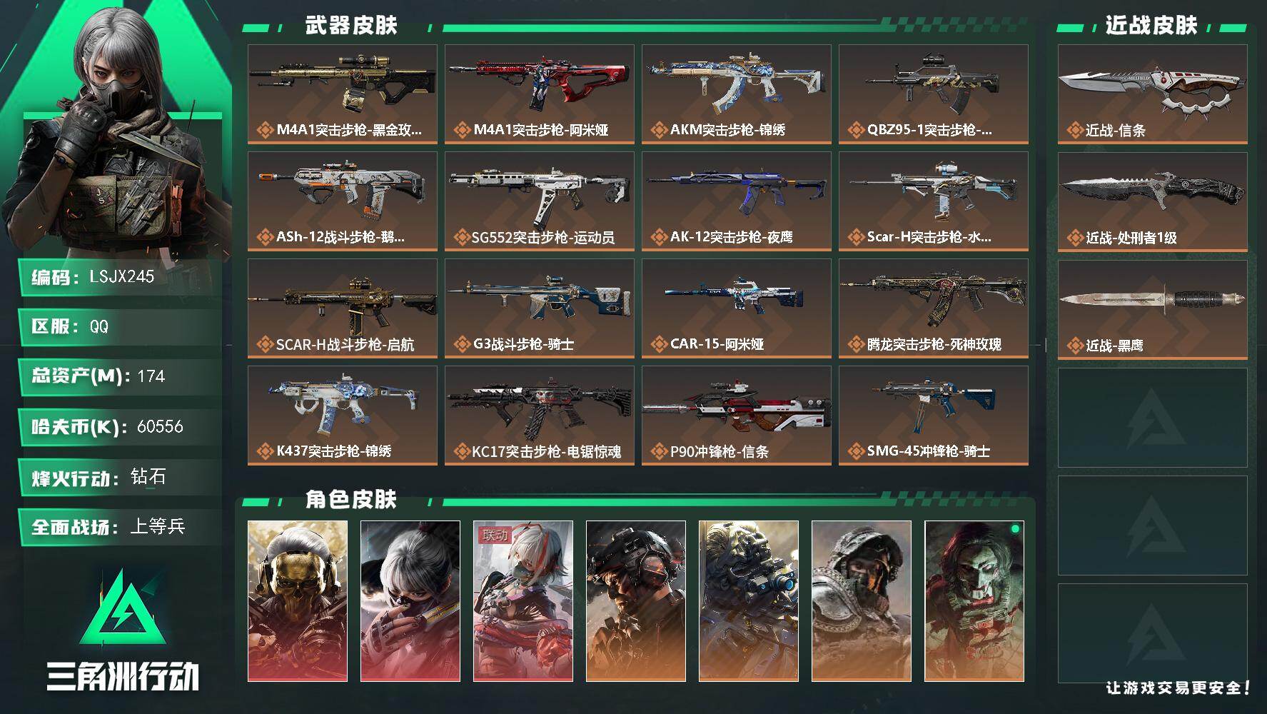 [17265547]【特价出售/店主推荐】174m总资产-60556k哈伏币-60烽火等级-钻石-41战场等级-上等兵 【干员外观】:红狼-蚀金玫瑰,骇爪-水墨云图,骇爪-维什戴尔,威龙-铁面判官,无名-夜鹰,深蓝-不破誓约,红狼-电锯惊魂,露娜-金牌射手 【近战皮肤】:近战-信条,近战-处刑者1级,近战-黑鹰 【传说外观】:M4A1突击步枪-蚀金玫瑰,M4A1突击步枪-阿米娅,AKM突击步枪-锦绣,QBZ95-1突击步枪-破军,ASh-12战斗步枪-鹅鸭杀,SG552突击步枪-运动员,AK-12突击步枪-夜鹰,SCAR-H战斗步枪-水墨云图,SCAR-H战斗步枪-启航,G3战斗步枪-骑士,CAR-15突击步枪-阿米娅,腾龙突击步枪-死神玫瑰,K437突击步枪-锦绣,KC17突击步枪-电锯惊魂,P90冲锋枪-信条,SMG-45冲锋枪-骑士,SMG-45冲锋枪-锦绣,QCQ171冲锋枪-鹅鸭杀,725双管霰弹枪-送葬人-无题密令,M250通用机枪-骑士之心,QJB201轻机枪-鹅鸭杀,M14射手步枪-蛮荒,SR-25射手步枪-水墨云图,SR-25射手步枪-信条,R93狙击步枪-维什戴尔 【史诗外观】:SR-25射手步枪-天命,AKM突击步枪-林中猎手,ASh-12战斗步枪-守夜人,ASh-12战斗步枪-无极限,K416突击步枪-竞技风,K416突击步枪-阿萨拉特攻,AUG突击步枪-蝮蛇,M7战斗步枪-百步穿杨,SG552突击步枪-尖端治疗,SCAR-H战斗步枪-国风,G3战斗步枪-阿萨拉工艺,G3战斗步枪-流沙送葬,G3战斗步枪-哈夫克警备,AS Val突击步枪-尖端治疗,AS Val突击步枪-典狱官,AS Val突击步枪-百步穿杨,腾龙突击步枪-猎鳄行动,K437突击步枪-守护者,MP5冲锋枪-深海恐惧,MP5冲锋枪-战术竞备,MP5冲锋枪-竞技风,Vector冲锋枪-阿萨拉文明,Vector冲锋枪-百步穿杨,SR-3M紧凑突击步枪-英雄,SR-3M紧凑突击步枪-战术竞备,勇士冲锋枪-深海恐惧,勇士冲锋枪-工业狂潮,MP7冲锋枪-守护者,MP7冲锋枪-六套之力,M1014霰弹枪-林中猎手,S12K霰弹枪-曙光,PKM通用机枪-蝮蛇,PKM通用机枪-守夜人,M249轻机枪-维京,M249轻机枪-丛影谍踪,M250通用机枪-囚徒,QJB201轻机枪-炽焰,Mini-14射手步枪-守护者,
