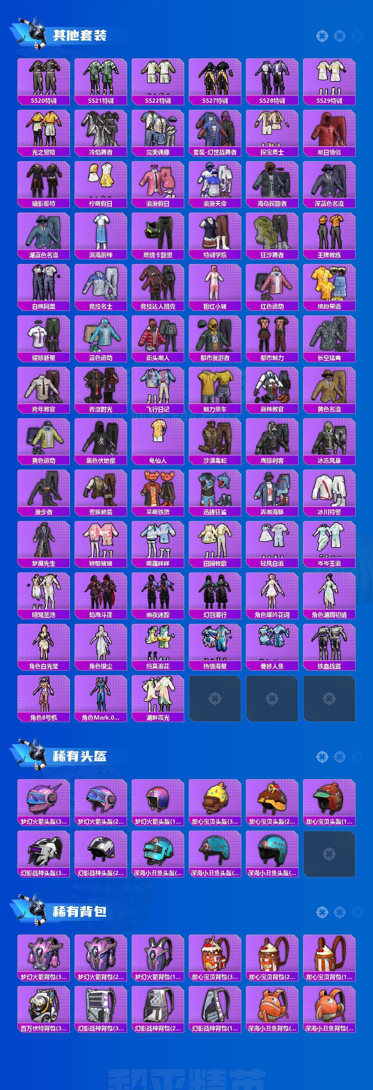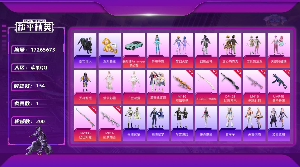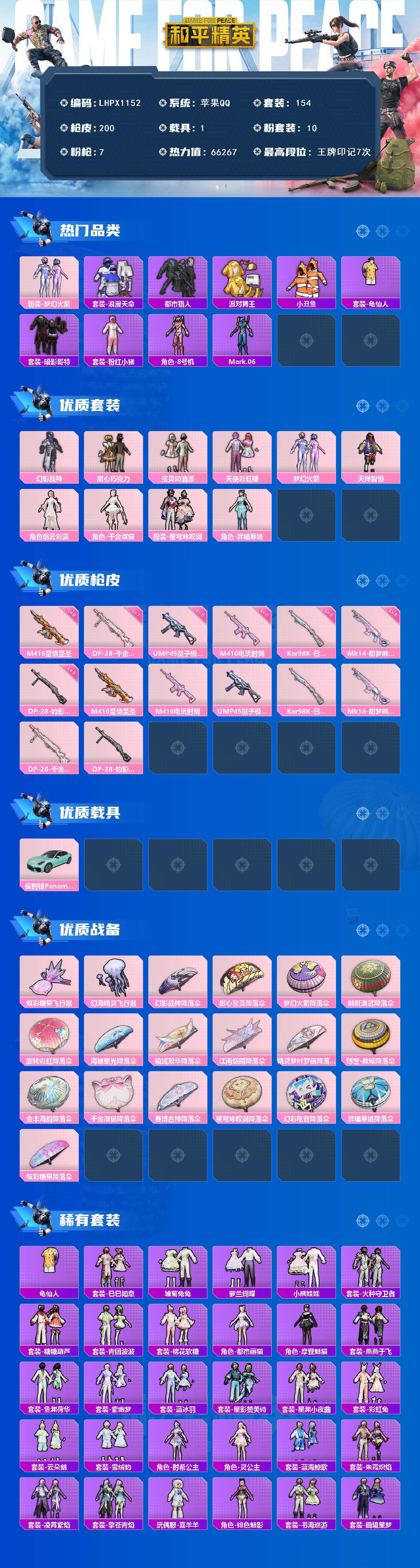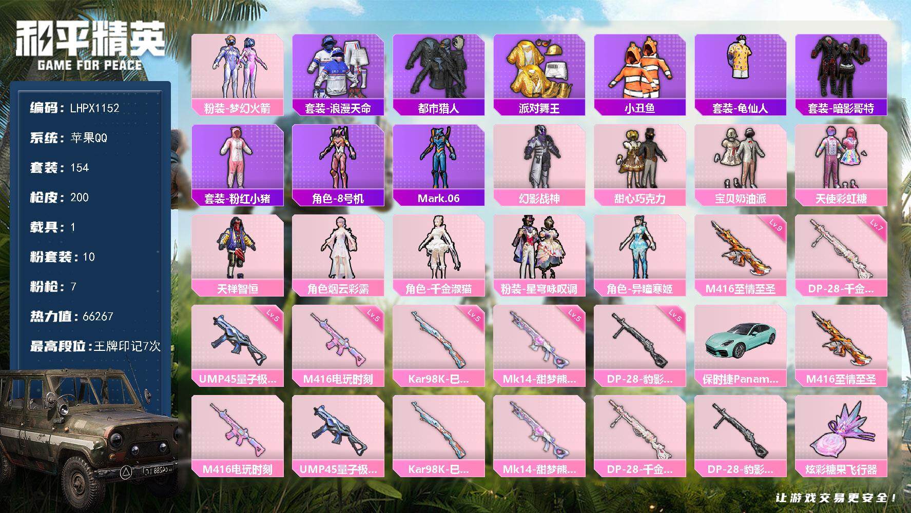 [17265673]M416-至情至圣(九级)苹果 手Q-10粉装-7特效枪-1载具-2粉色飞行器-66267热力值-7王牌印记-154套装-200枪皮 【热门品类】:粉装-梦幻火箭,套装-浪漫天命,套装-都市猎人,套装-派对舞王,套装-小丑鱼,套装-龟仙人,套装-暗影哥特,套装-粉红小猪,角色-8号机,角色-Mark.06 【粉色套装】:粉装-幻影战神,粉装-甜心巧克力,粉装-宝贝奶油派,粉装-天使彩虹糖,粉装-梦幻火箭,粉装-天禅智恒,角色-烟云彩露,角色-千金淑猫,粉装-星穹咏叹调,角色-异瞳寒姬 【粉色枪皮等级】:M416-至情至圣(九级),M416-电玩时刻(五级),UMP45-量子极限(五级),Kar98K-巳巳如意(五级),Mk14-甜梦熊击(五级),DP-28-千金淑猫(七级),DP-28-豹影疾电(五级) 【粉色载具】:保时捷Panamera(梦幻青) 【粉色枪皮】:M416-至情至圣,M416-电玩时刻,UMP45-量子极限,Kar98K-巳巳如意,Mk14-甜梦熊击,DP-28-千金淑猫,DP-28-豹影疾电 【粉色飞行器】:炫彩糖果飞行器,幻海精灵飞行器 【粉色降落伞】:幻影战神降落伞,甜心宝贝降落伞,梦幻火箭降落伞,翩跹演武降落伞,旋转彩虹降落伞,海螺星光降落伞,镜域双华降落伞,江南烟雨降落伞,精灵梦叶罗丽降落伞,创世·救赎降落伞,金丰海韵降落伞,千金淑猫降落伞,赛博古神降落伞,星穹咏叹调降落伞,幻彩电音降落伞,异瞳寒姬降落伞,炫彩糖果降落伞 【稀有套装】:套装-龟仙人,套装-巳巳如意,套装-雪国风尚,套装-炫彩糖果,套装-雏菊兔兔,套装-萝兰蝴蝶,套装-小熊娃娃,套装-火种守卫者,套装-糖糖葫芦,套装-青团波波,套装-棉花软糖,角色-都市丽猫,角色-摩登魅猫,套装-燕燕于飞,套装-鱼渊荷华,套装-紫幽梦,套装-蓝冰羽,套装-星影赞美诗,套装-星渊小夜曲,套装-彩虹兔,套装-云朵鹅,套装-雪绒豹,角色-时希公主,角色-灵公主,套装-蓝海鲸歌,套装-朱霞炽焰,套装-凌霄紫焰,套装-擎苍青焰,玩偶服-喜羊羊,角色-绯色魅影,套装-书海巡游,套装-画境星梦,套装-琴音绮想 【稀有枪皮】:AUG-冰晶雪宝,AKM-彩虹符号,AKM-影袭,AKM-江南烟雨,AKM-缤纷海域,M16A4-幻世战舞者,M16A4-千金淑猫,SCAR-L-玉兔迎春,SCAR-L-冷漠罗丽,