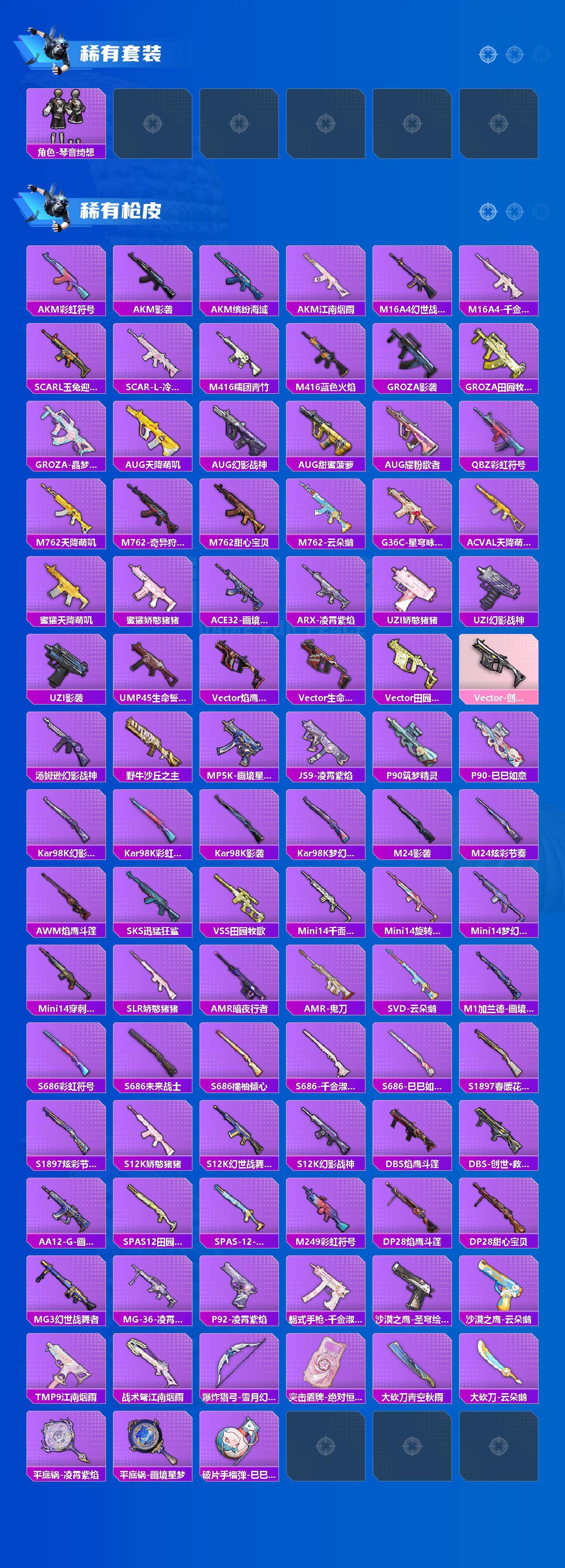【稀有枪皮】:AUG-冰晶雪宝,AKM-彩虹符号,AKM-影袭,AKM-江南烟雨,AKM-缤纷海域,M16A4-幻世战舞者,M16A4-千金淑猫,SCAR-L-玉兔迎春,SCAR-L-冷漠罗丽,