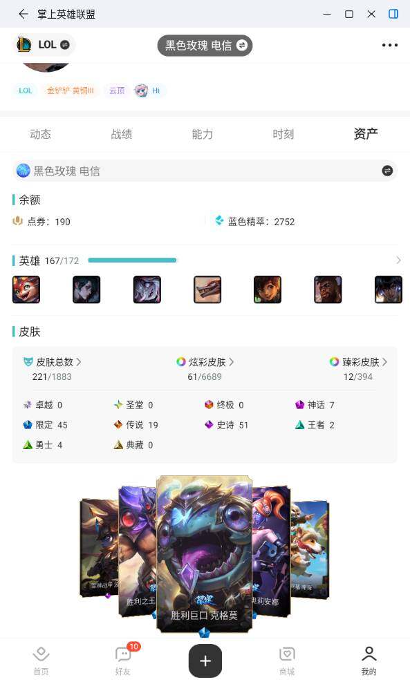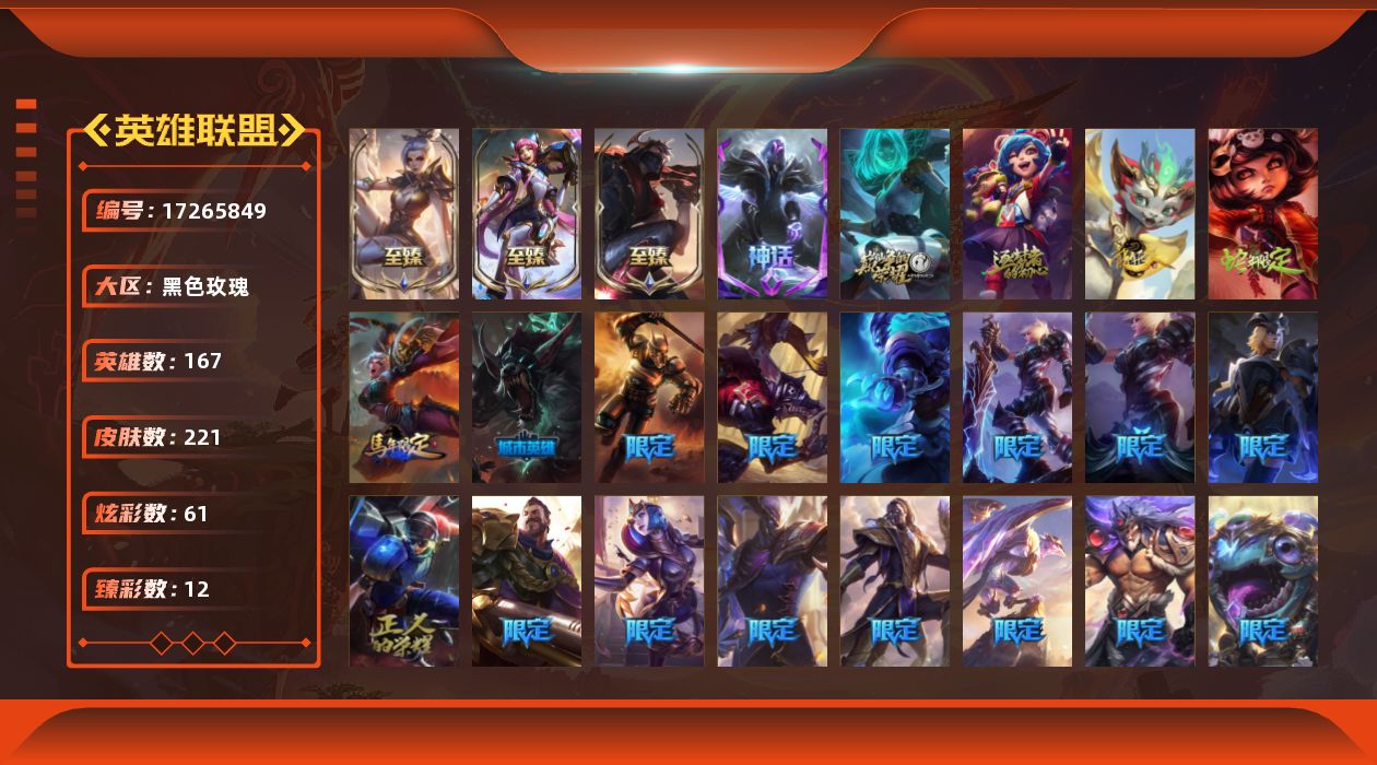 [17265849]未定级段位-167英雄-221皮肤-61炫彩-0终极-7神话-45限定-19传说-51史诗