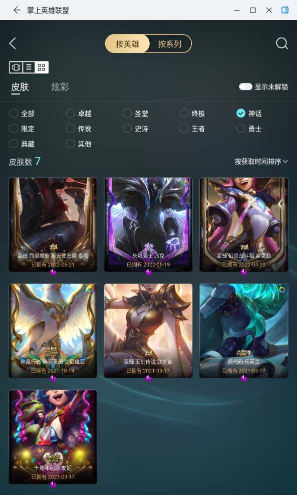【神话皮肤】:十周年纪念安妮,源代码乐芙兰,神凰行者瑞羽圣凰艾尼维亚,灰烬骑士派克,至臻幻灵战斗猫金克丝,至臻西部魔影猎天使恶魔泰隆,至臻玉剑传说武剑仙