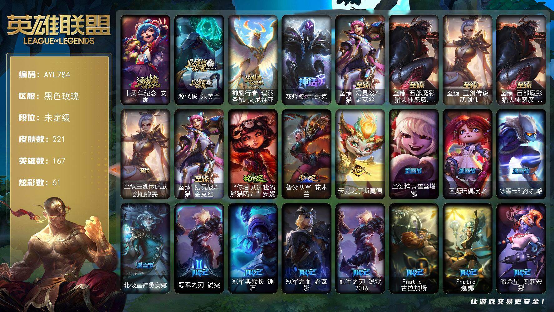 [17265849]未定级段位-167英雄-221皮肤-61炫彩-0终极-7神话-45限定-19传说-51史诗 【神话皮肤】:十周年纪念安妮,源代码乐芙兰,神凰行者瑞羽圣凰艾尼维亚,灰烬骑士派克,至臻幻灵战斗猫金克丝,至臻西部魔影猎天使恶魔泰隆,至臻玉剑传说武剑仙 【热门头像】:银河魔装机神安妮头像 【至臻皮肤】:至臻西部魔影猎天使恶魔泰隆,至臻玉剑传说武剑仙锐雯,至臻幻灵战斗猫金克丝 【臻彩皮肤】:替父从军花木兰炫金龙刃,冠军之刃锐雯2016凯旋圣装,黎明使者锐雯黑夜使者,霸天巨兽雪崩墨菲特,魔女阿卡丽虚荣,净雪之月莫甘娜冬虹,红莲之刃锐雯 【年限皮肤】:你看见过我的熊猫吗安妮,替父从军花木兰,天龙之子斯莫德 【冰雪限定】:圣诞精灵崔丝塔娜,圣诞玩偶波比,冰雪节玛尔扎哈,北极星神黛安娜 【限定皮肤】:冠军之刃锐雯,冠军典狱长锤石,冠军之血希瓦娜,冠军之刃锐雯2016,Fnatic古拉加斯,Fnatic迦娜,暗杀星奥莉安娜,SSW辛吉德,SKTT1阿利斯塔,SSG嘉文四世,SSG塔莉垭,EDG格雷福斯,EDG佛耶戈,EDG佐伊,EDG厄斐琉斯,EDG悠米,DRX亚托克斯,DRX千珏,DRX阿卡丽,DRX艾希,DRX凯特琳,DRX茂凯,胜利枪神格雷福斯,胜利女神奥莉安娜,胜利之剑亚托克斯,胜利枪神卢锡安,胜利凤凰艾尼维亚,胜利之王泰达米尔,胜利巨口克格莫,海贼瑞兹,鬼影森森茂凯,泳池派对凯特琳,泳池派对李青,暗影沃里克,勇者阿狸,都铎王朝图奇,防暴天使凯尔,警用试作体K9内瑟斯 【传说皮肤】:地狱之门卫士加里奥,大天使长米迦勒凯尔,提莫约德尔人的一大步,恶魔之刃泰达米尔,最终BOSS维迦,陆地王者4WD布里茨,冰川巨兽墨菲特,上古战魂魔腾,地狱行者孙悟空,神拳李青,源计划净化薇恩,腥红之月鬼武姬阿卡丽,死亡骑士盖伦,黎明使者锐雯,焰尾妖狐阿狸,泳池派对吉格斯,灌篮高手德莱厄斯,神王德莱厄斯,源计划毁灭派克 【史诗皮肤】:科学怪熊的新娘安妮,摄魂男爵弗拉基米尔,圣光审判凯尔,铁血剑豪易,地狱火阿利斯塔,钢铁之心希维尔,圣洁化身索拉卡,狼外婆沃里克,小小骑士阿木木,殇之机器人阿木木,掠星魔刃卡萨丁,特种部队普朗克,穿着正装的恶魔维迦,绝代智将斯维因,抵抗军天使凯特琳,霸天巨兽墨菲特,蓝焰梦魔魔腾,符文战神雷克顿,龙骑统帅嘉文四世,暗星奥莉安娜,三昧真火孙悟空,至高之拳李青,地下拳王李青,四