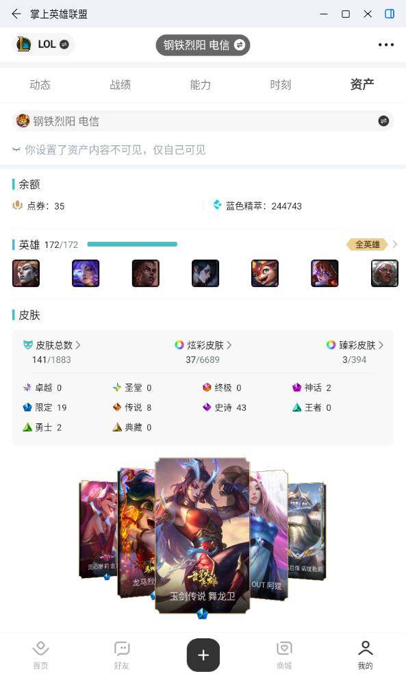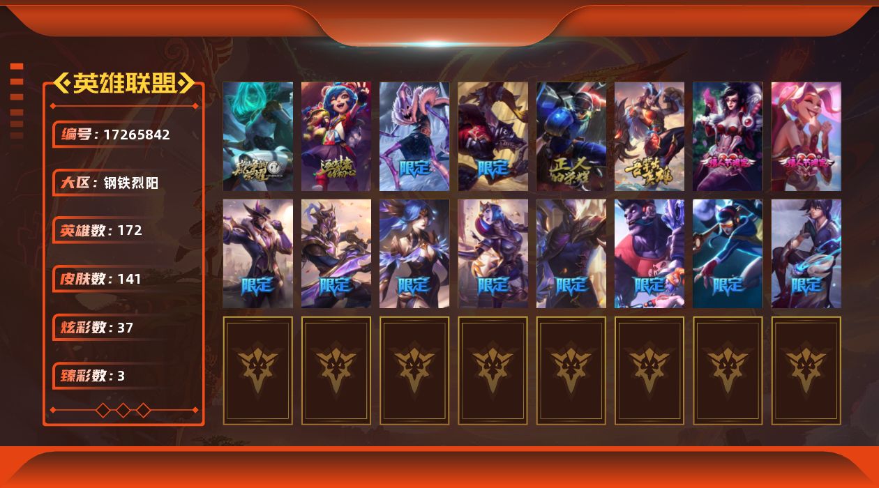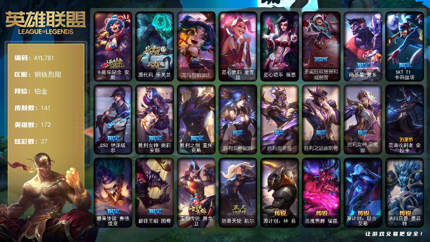 [17265842]铂金段位-172英雄-141皮肤-37炫彩-0终极-2神话-19限定-8传说-43史诗
