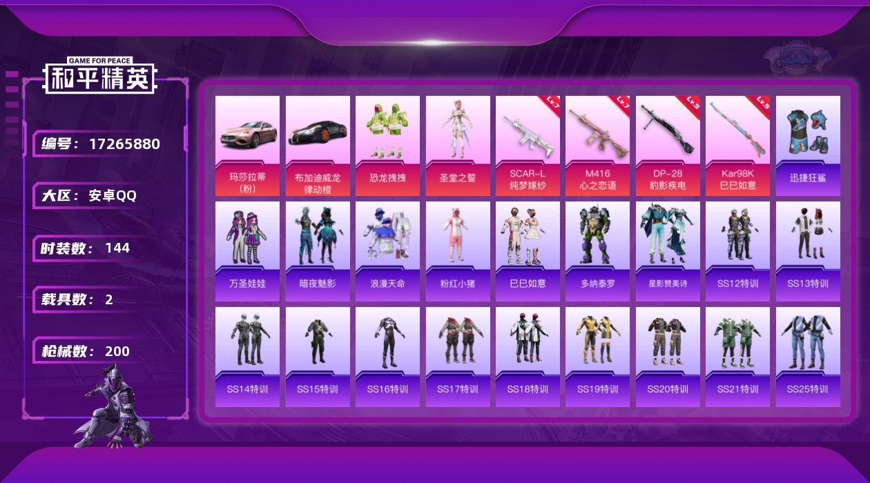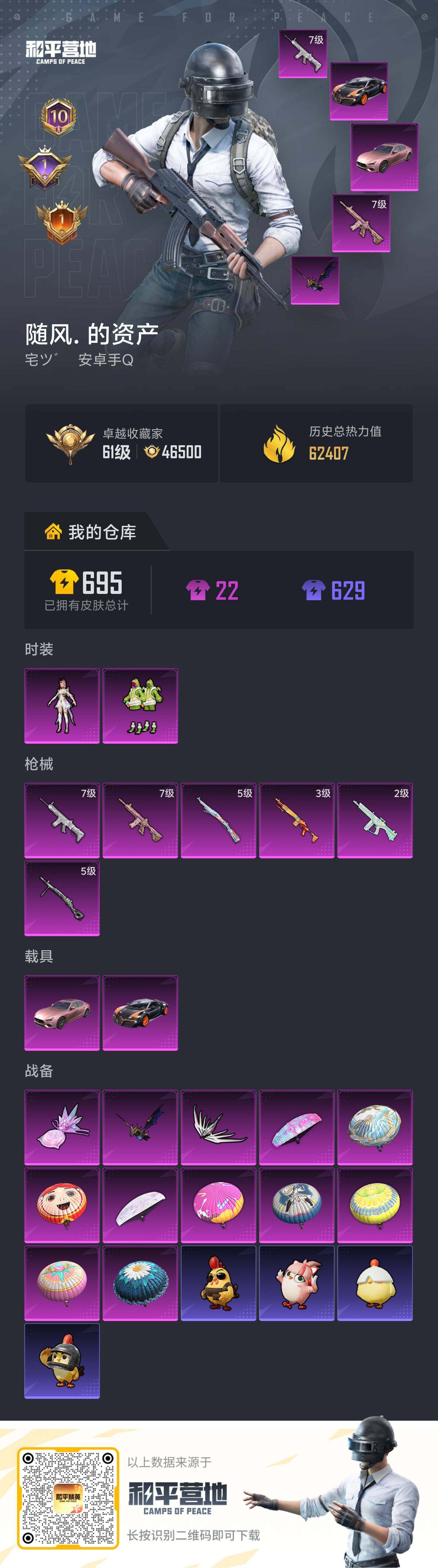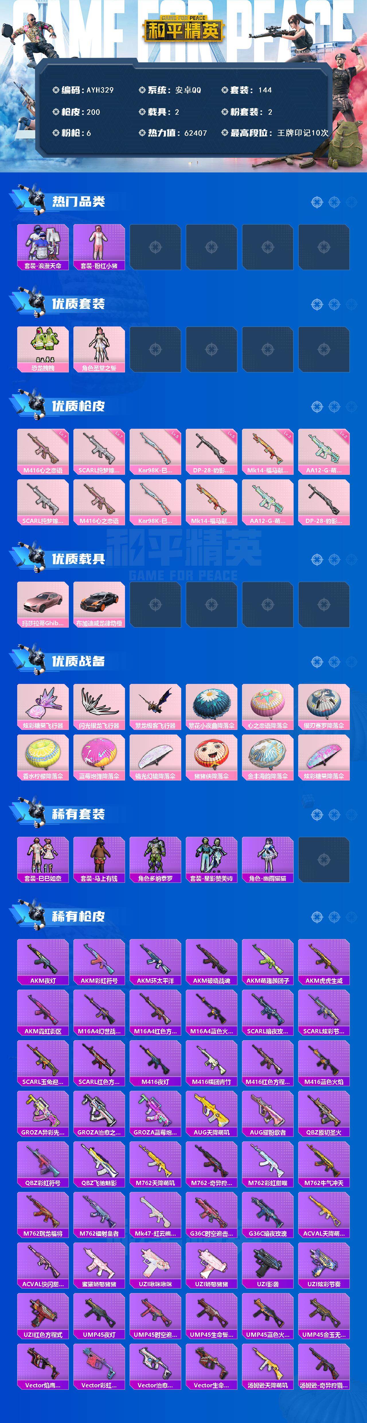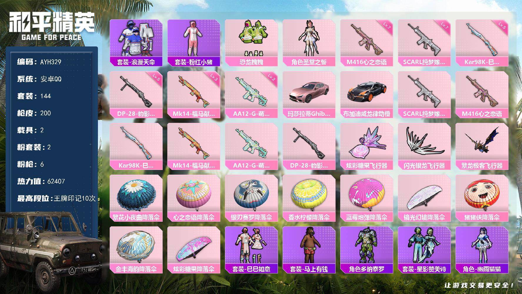 [17265880]【店主推荐捡漏号】安卓 手Q-2粉装-6特效枪-2载具-3粉色飞行器-62407热力值-10王牌印记-144套装-200枪皮【热门品类】:套装-浪漫天命,套装-粉红小猪【粉色套装】:粉装-恐龙拽拽,角色-圣堂之誓【粉色枪皮等级】:SCAR-L-纯梦嫁纱(七级),M416-心之恋语(七级),Kar98K-巳巳如意(五级),Mk14-福马献瑞(三级),AA12-G-萌骑幻想(二级),DP-28-豹影疾电(五级)【粉色载具】:玛莎拉蒂Ghibli(粉),布加迪威龙(律动橙)【粉色枪皮】:SCAR-L-纯梦嫁纱,M416-心之恋语,Kar98K-巳巳如意,Mk14-福马献瑞,AA12-G-萌骑幻想,DP-28-豹影疾电