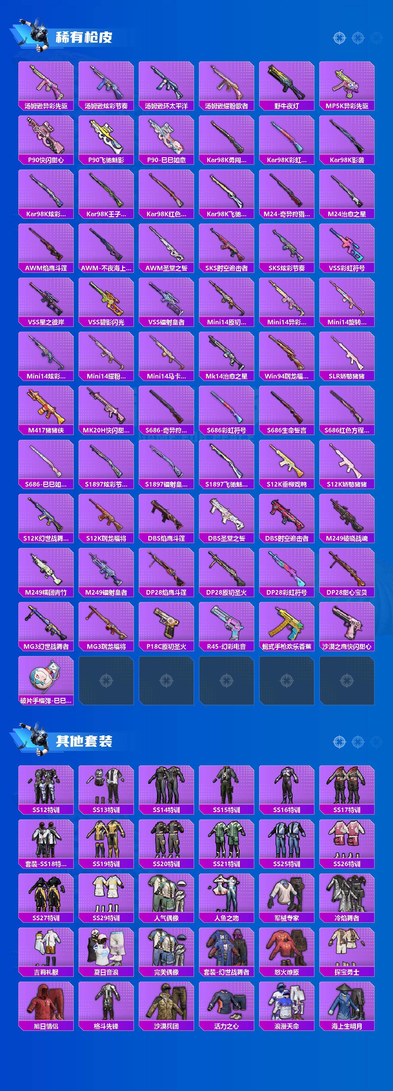- PX_2109395--女娲灵识】YXc12571【可二次】【因赛季更新游戏段付以上号为准!】苹果Q-1w热力值 2王牌印记 历史卓越王牌10星 31套装 60枪皮 【1稀有】 浪漫天命 【1粉装】 女娲灵识 【7特效枪】 M416-女娲灵识 (3级) Kar98K-巳巳如意 (5级) AUG-圣斗士星矢 (4级) AUG-暖羊咩咩 (5级) Mk14-甜梦熊击 (5级) MK12-雪月幻音 (1