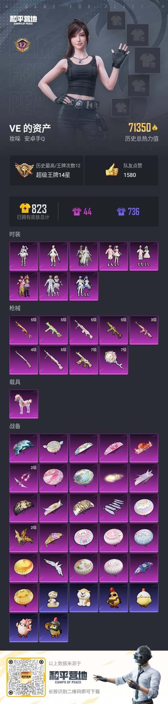 [17265831]安卓 手Q-8粉装-9特效枪-1载具-5粉色飞行器-71350热力值-12王牌印记-148套装-205枪皮