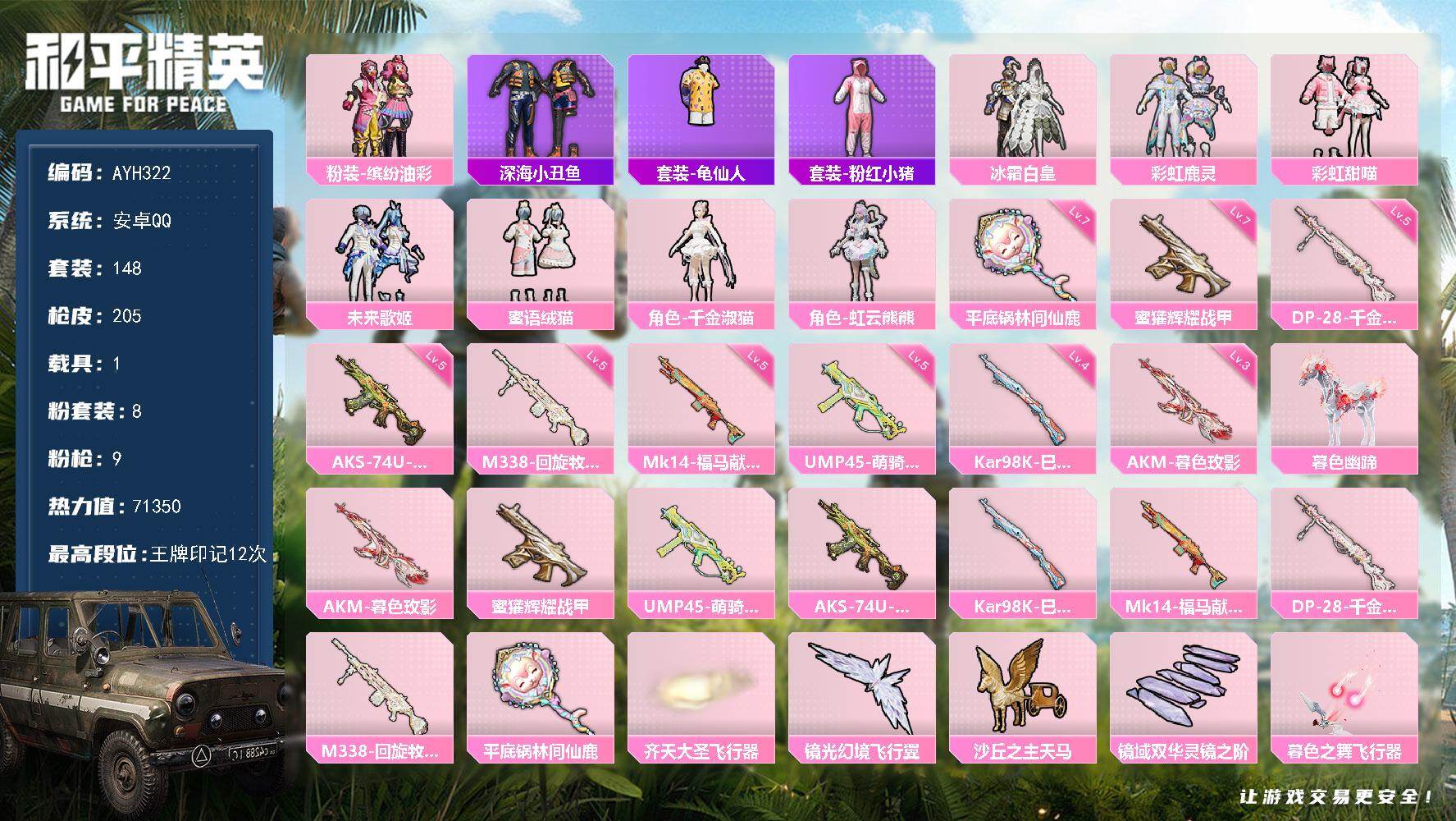[17265831]安卓 手Q-8粉装-9特效枪-1载具-5粉色飞行器-71350热力值-12王牌印记-148套装-205枪皮 【热门品类】:粉装-缤纷油彩,套装-深海小丑鱼,套装-龟仙人,套装-粉红小猪 【粉色套装】:粉装-缤纷油彩,粉装-冰霜白皇,粉装-彩虹鹿灵,粉装-彩虹甜喵,粉装-未来歌姬,粉装-蜜语绒猫,角色-千金淑猫,角色-虹云熊熊 【粉色枪皮等级】:AKM-暮色玫影(三级),蜜獾-辉耀战甲(七级),UMP45-萌骑冒险(五级),AKS-74U-森灵之息(五级),Kar98K-巳巳如意(四级),Mk14-福马献瑞(五级),DP-28-千金淑猫(五级),M338-回旋牧梦使(五级),平底锅-林间仙鹿(七级) 【粉色载具】:暮色幽蹄 【粉色枪皮】:AKM-暮色玫影,蜜獾-辉耀战甲,UMP45-萌骑冒险,AKS-74U-森灵之息,Kar98K-巳巳如意,Mk14-福马献瑞,DP-28-千金淑猫,M338-回旋牧梦使,平底锅-林间仙鹿 【粉色飞行器】:齐天大圣飞行器,镜光幻境飞行翼,沙丘之主天马,镜域双华-灵镜之阶,暮色之舞飞行器 【粉色降落伞】:绝对恒星降落伞,春暖花开降落伞,童趣迷兔降落伞,垂柳戏鸭降落伞,彩虹甜喵降落伞,第五大道降落伞,白勺歌姬降落伞,沙丘之主降落伞,祥瑞锦鲤降落伞,甜心首席降落伞,蜜语绒猫降落伞,镜域双华降落伞,辉耀战甲降落伞,鎏金朋克降落伞,江南烟雨降落伞,金丰海韵降落伞,樱桃泡泡降落伞,霁蓝缠春降落伞,暮色玫影降落伞,回旋牧梦使降落伞,辉云木星降落伞 【稀有套装】:套装-龟仙人,套装-巳巳如意,套装-雪国风尚,套装-马上来财,套装-雏菊兔兔,套装-萝兰蝴蝶,套装-糖糖葫芦,套装-青团波波,套装-棉花软糖,角色-瑰梦爱神,套装-书海巡游,套装-画境星梦,套装-琴音绮想,角色-碧青流霞,角色-杯旋调茶师,套装-雨过天青,套装-红釉青花 【稀有枪皮】:AKM-生命誓言,AKM-破晓战魂,AKM-龙的传人,M16A4-甜心亚梦,SCAR-L-炫彩节奏,SCAR-L-玉兔迎春,SCAR-L-红色方程式,M416-糯团青竹,M416-红色方程式,M416-绯红前夜,M416-蓝色火焰,GROZA-影袭,GROZA-懵萌河马,GROZA-暮色玫影,AUG-2P战斗服款,AUG-冰川粉黛,AUG-天降萌叽,AUG-耀粉歌者,QBZ-未来歌姬,QBZ-洛神天依,QBZ-