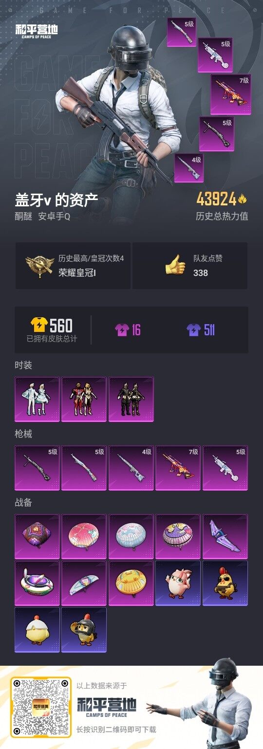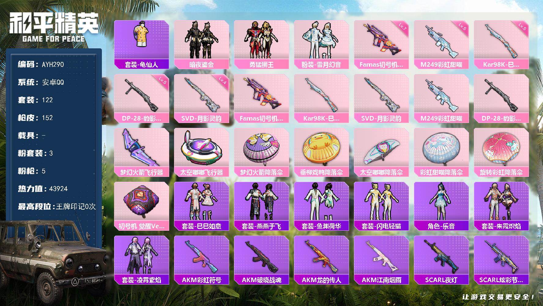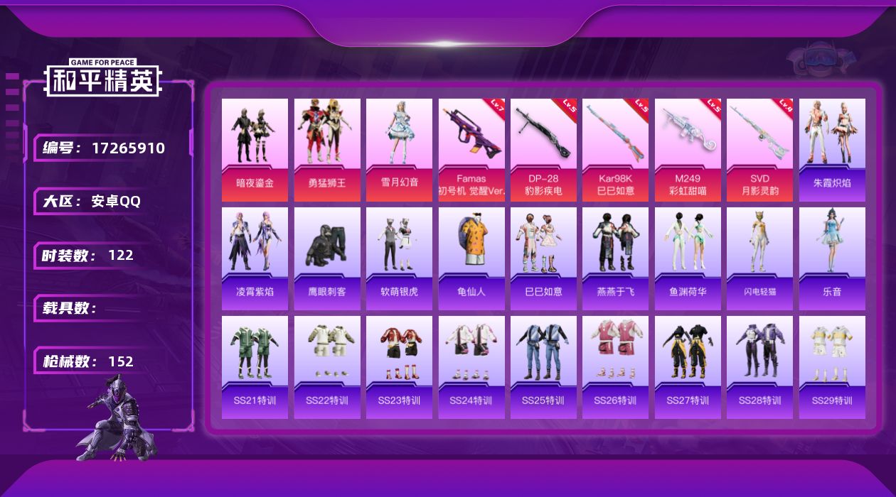 [17265910]安卓 手Q-3粉装-5特效枪-0载具-2粉色飞行器-43924热力值-1王牌印记-122套装-152枪皮【热门品类】:套装-龟仙人【粉色套装】:粉装-暗夜鎏金,粉装-勇猛狮王,粉装-雪月幻音【粉色枪皮等级】:Famas-初号机 觉醒Ver.(七级),Kar98K-巳巳如意(五级),SVD-月影灵韵(四级),M249-彩虹甜喵(五级),DP-28-豹影疾电(五级)【粉色枪皮】:Famas-初号机 觉醒Ver.,Kar98K-巳巳如意,SVD-月影灵韵,M249-彩虹甜喵,DP-28-豹影疾电【粉色飞行器】:梦幻火箭飞行器,太空嘟嘟飞行器