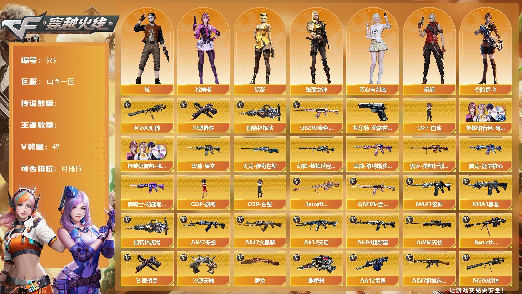 [16337488]山西一区-49V-0王者-0炫金 【热门武器】:QBZ03-金色蔷薇,M200-幻神,柯尔特-荣耀世冠白鲨2023,加特林-炼狱,COP-白鲨*2,沙鹰-修罗*2 【音效卡】:枪娘语音包-阿敏,枪娘语音包-凯萨林 【皮肤】:幻神-荣耀世冠白鲨2023 皮肤,雷神-星空,雷神-维纳斯皮肤,毁灭-英雄计划 皮肤,黑龙-能量核心,黑骑士-幻能朋克 皮肤,AWM-天龙-传奇白鲨 【角色】:炫,枪娘樱,堕落女神,狐影,芳心审判者,娟娟,曼陀罗-X,潘多拉-X,潘多拉-甜心教官 【人偶武器】:COP-白鲨*2,COP-旗袍 【英雄级武器】:AK47-火麒麟*2,M4A1-黑龙*2,M4A1-雷神,AK47-无影,AK12-天启,AN94-超新星*2,AK47-机械迷城,AK47-黑鲨,QBZ03-金色蔷薇,AWM-天龙,Barrett-毁灭*2,M200-幻神,Barrett-金色蔷薇,加特林-炼狱,AA-12-雷霆,沙鹰-修罗*2,沙鹰-天神*2,柯尔特-荣耀世冠白鲨2023,屠龙*2,麒麟刺,高爆手雷-雷霆*4,闪光弹-雷霆*4,烟雾弹-雷霆*4 【道具】:BS战队炫彩背包,CFS限定背包,炫彩背包,绿色巨人,灵魂忍者,迷雾幽灵,夺命之镰,防化服*3,枪王排位29赛季金色流光,EP战队击杀图标,防弹头盔*3,防弹衣*3,C4工具钳*3,手雷包*3 【特殊枪械】:1炼狱