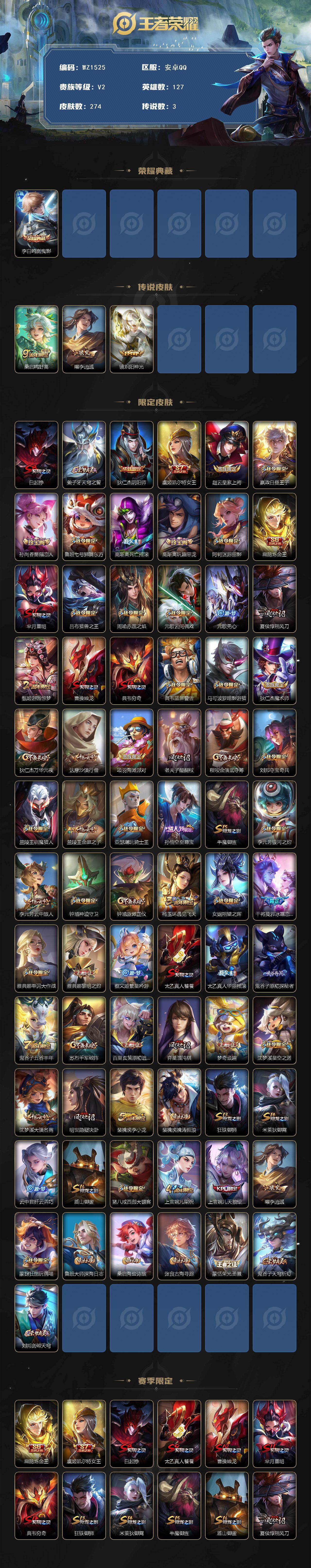 [17266335]安卓Q-V2-最强王者段位-127英雄-274皮肤-1典藏皮肤-3传说-66史诗