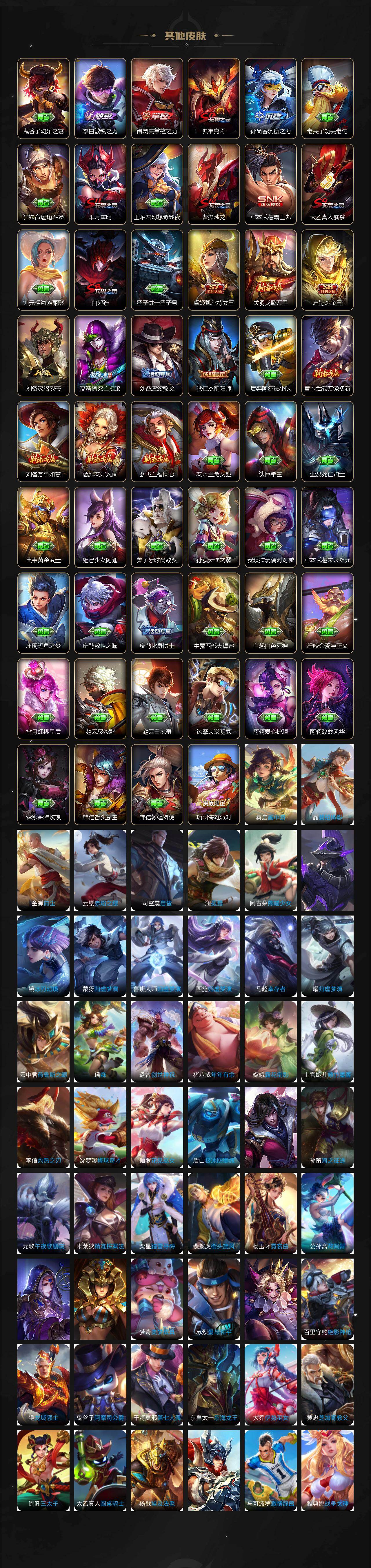 扁鹊炼金王,虞姬凯尔特女王,白起狰,太乙真人饕餮,曹操烛龙,芈月重明,典韦穷奇,狂铁御狮,米莱狄御霄,牛魔御旌,盾山御銮,夏侯惇朔风刀,明世隐疑决卦,老夫子醍醐杖,鬼谷子原初探秘者,狄仁杰万华元夜,程咬金演武夺筹,钟馗驱傩正仪,苏烈千军破阵,吕布猎兽之王,嬴政白昼王子,女娲朔望之晖,典韦蓝屏警告,钟馗神迹守卫,鲁班七号狮舞东方,沈梦溪星空之诺,李元芳银河之约,刘邦夺宝奇兵,马可波罗暗影游猎,蒙犽狂想玩偶喵,元歌云间偶戏,弈星混沌棋,达摩沙漠行僧,兰陵王金庭之子,沈梦溪大漠名商,李元芳云中旅人,桑启海盐诗旅,裴擒虎擒涛扼浪,鲁班大师探海日志,张良古海寻踪