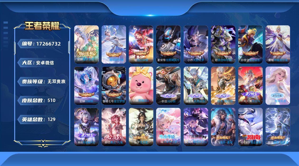 - [15299476]安卓WX-V9-最强王者段位-满蛇年!-128英雄-426皮肤-1典藏皮肤-1典藏英雄-1无双-30传说-147史诗 【英雄全皮】:刘禅全皮,孙权全皮,苍全皮,百里守约全皮,阿古朵全皮,司空震全皮,云缨全皮,金蝉全皮,赵怀真全皮,莱西奥全皮,戈娅全皮,空空儿全皮,影全皮 【荣耀典藏】:武则天英雄,武则天倪克斯神谕 【无双皮肤】:甄姬雪境奇遇 【传说皮肤】:后羿神树通天,杨玉环星之鸣奏,司空震愿照山河定,女娲愿照千秋盛,妲己愿照众生和,澜愿照九州拓,蔡文姬愿照福禄聚,虞姬愿照岁时盈,云缨幻光神枪,嬴政玄雷天君,桑启鸣野蒿,孙尚香乘龙问璇玑,赵云乘龙铭钟鼎,铠琥珀纪元,鲁班七号时之奇旅,兰陵王影龙天霄,云缨鹤归松栖,诸葛亮鹤羽星尊,孙悟空齐天大圣,小乔山海琳琅生,李信山海炽霜斩,百里守约碎云,孙尚香音你闪耀,赵云淬星耀世,李元芳飞鸢探春,镜炽阳神光,虞姬启明星使,貂蝉猫影幻舞,干将莫邪久胜战神,后羿黄金射手座 【限定皮肤】:蔡文姬夏日便利店,大乔绒语心约,虞姬夏日便利店,狄仁杰阴阳师,小乔山海琳琅生,赵云皇家上将,赵云引擎之心,嬴政优雅恋人,孙尚香蔷薇恋人,鲁班七号乒乒小将,鲁班七号时之奇旅,庄周高山流水,高渐离死亡摇滚,钟无艳超时空战士,扁鹊奇幻香踪,白起夜都怪侠,芈月幻夜卜梦,元歌无心,甄姬游园惊梦,甄姬落雪兰心,典韦岱宗,马可波罗山海玄木吟,狄仁杰魔术师,狄仁杰万华元夜,达摩沙漠行僧,项羽海滩派对,程咬金演武夺筹,王昭君午后时光,兰陵王影龙天霄,兰陵王金庭之子,亚瑟潮玩骑士王,孙悟空美猴王,孙悟空至尊宝,孙悟空孙行者,孙悟空齐天大圣,后羿圣弓游侠,刘备百相守梦,李元芳匿光侦查者,李元芳云中旅人,虞姬启明星使,钟馗驱傩正仪,杨戬潮玩骑兵,女娲朔望之晖,干将莫邪真爱魔法,雅典娜黎明之约,鬼谷子原初探秘者,鬼谷子五谷丰年,诸葛亮鹤羽星尊,黄忠火炮绅士,苏烈千军破阵,百里玄策原初追逐者,百里守约朱雀志,梦奇顽趣,沈梦溪大漠名商,沈梦溪匿光破解者,明世隐吟游魔法,裴擒虎李小龙,裴擒虎擒涛扼浪,狂铁电玩高手,米莱狄胡桃异想国,云中君纤云弄巧,李信山海炽霜斩,嫦娥拒霜思,嫦娥暖冬兔眠,西施玲珑珍味,鲁班大师探海日志,桑启海盐诗旅,金蝉唐三藏,暃星界游侠,戈娅驭风魔法,艾琳女武神,艾琳流音漫舞,赵怀真鹤归松栖,云缨鹤归松栖,司空震地狱燃心,阿古朵江河有灵,张良古海寻踪,蒙犽百解