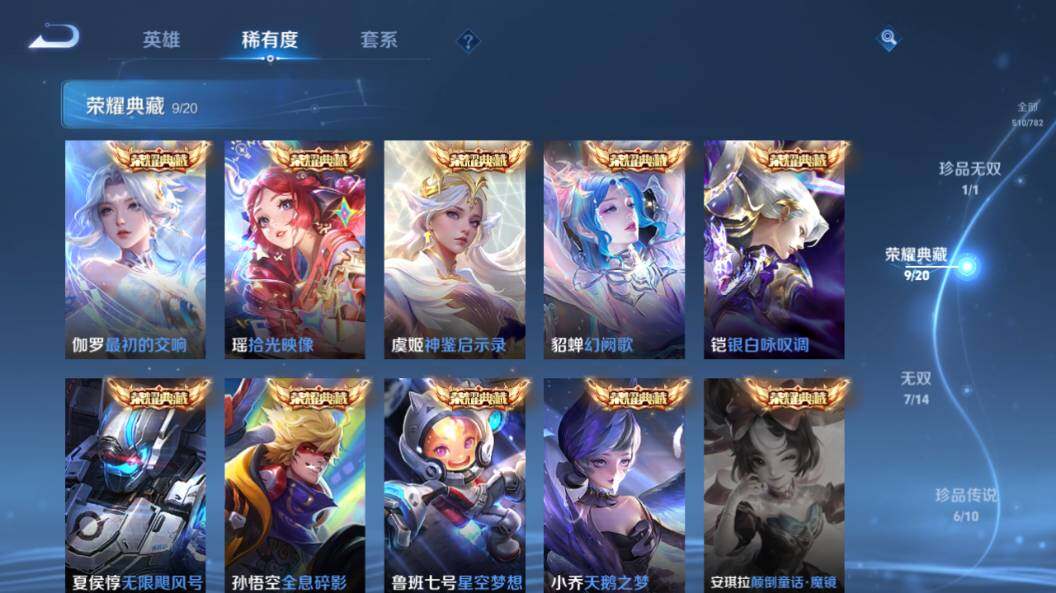 【荣耀典藏】:武则天英雄,孙悟空全息碎影,夏侯惇无限飓风号,小乔天鹅之梦,鲁班七号星空梦想,铠银白咏叹调,貂蝉幻阙歌,虞姬神鉴启示录,瑶拾光映像,伽罗最初的交响