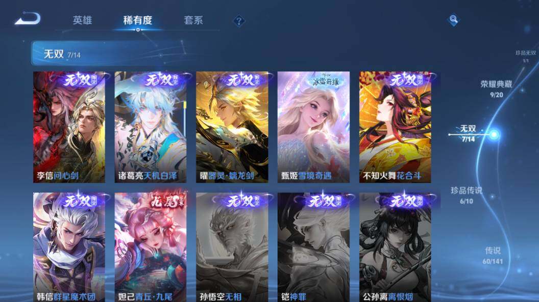 【无双皮肤】:李信问心剑,诸葛亮天机白泽,曜器灵螭龙剑,甄姬雪境奇遇,不知火舞花合斗,韩信群星魔术团,妲己青丘九尾