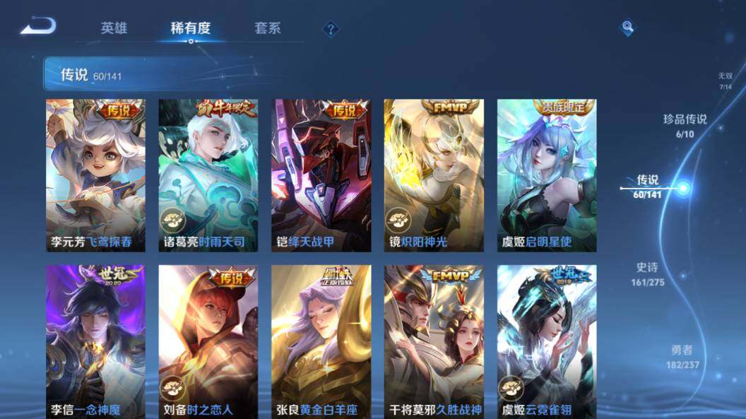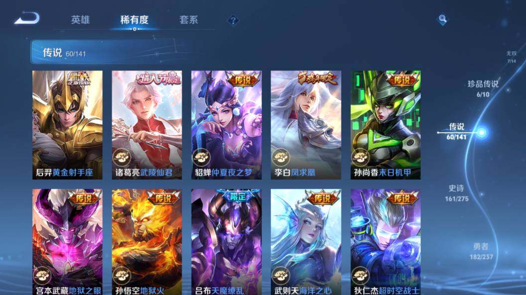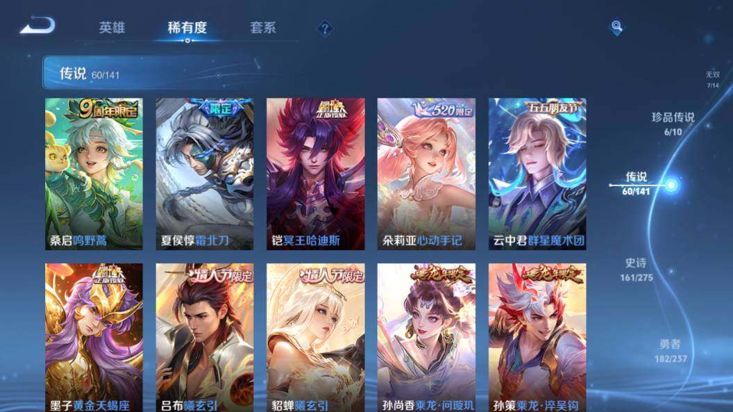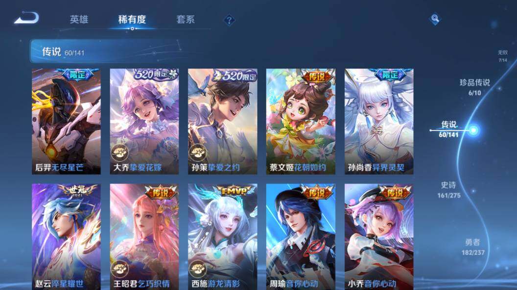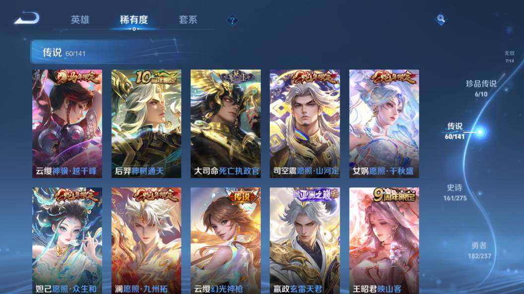 【传说皮肤】:云缨神骥越千峰,后羿神树通天,大司命死亡执政官,司空震愿照山河定,女娲愿照千秋盛,妲己愿照众生和,澜愿照九州拓,云缨幻光神枪,嬴政玄雷天君,王昭君映山客,桑启鸣野蒿,夏侯惇霜北刀,铠冥王哈迪斯,朵莉亚心动手记,云中君群星魔术团,墨子黄金天蝎座,吕布曦玄引,貂蝉曦玄引,孙尚香乘龙问璇玑,孙策乘龙淬吴钩,艾琳觅芳踪,露娜霜月吟,孙膑小动物乐团,大乔时之奇旅,马可波罗妄想实况,夏洛特浮生妄,干将莫邪画中仙,小乔山海琳琅生,王昭君星穹之声,娜可露露前尘镜,后羿无尽星芒,大乔挚爱花嫁,孙策挚爱之约,蔡文姬花朝如约,孙尚香异界灵契,赵云淬星耀世,王昭君乞巧织情,西施游龙清影,周瑜音你心动,小乔音你心动,李元芳飞鸢探春,诸葛亮时雨天司,铠绛天战甲,镜炽阳神光,虞姬启明星使,李信一念神魔,刘备时之恋人,张良黄金白羊座,干将莫邪久胜战神,虞姬云霓雀翎,后羿黄金射手座,诸葛亮武陵仙君,貂蝉仲夏夜之梦,李白凤求凰,孙尚香末日机甲,宫本武藏地狱之眼,孙悟空地狱火,吕布天魔缭乱,武则天海洋之心,狄仁杰超时空战士