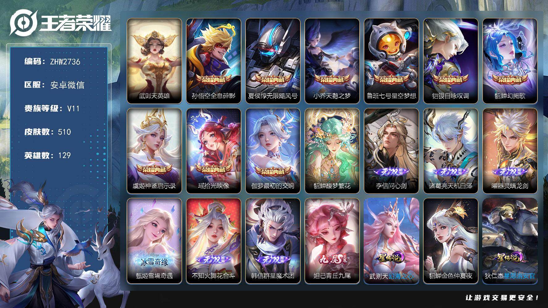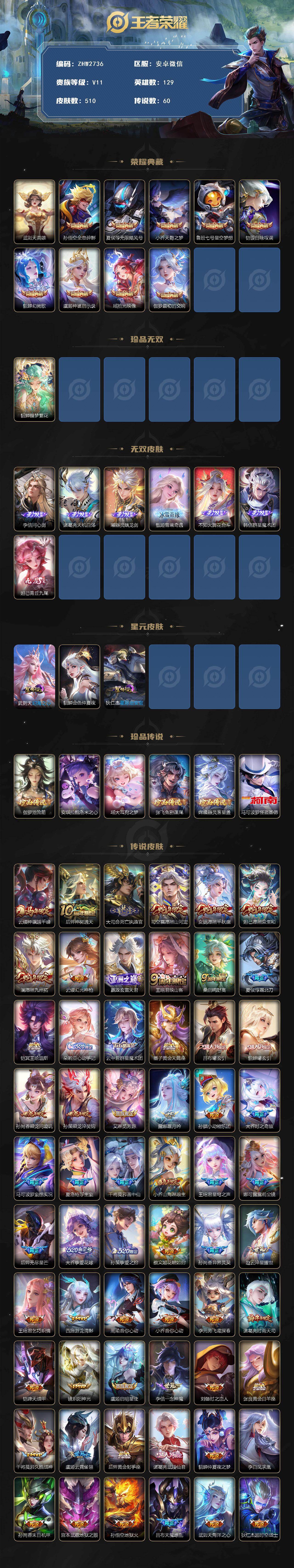 [17266732]背包1水晶!露比小兵!4天幕!安卓WX-V11-最强王者段位-129英雄-510皮肤-9典藏皮肤-1典藏英雄-1珍品无双-7无双-6珍品传说-60传说-160史诗 【英雄全皮】:嬴政全皮,夏侯惇全皮,刘邦全皮,孙权全皮,大乔全皮,苏烈全皮,盾山全皮,敖隐全皮,桑启全皮,金蝉全皮,空空儿全皮,影全皮,海诺全皮 【荣耀典藏】:武则天英雄,孙悟空全息碎影,夏侯惇无限飓风号,小乔天鹅之梦,鲁班七号星空梦想,铠银白咏叹调,貂蝉幻阙歌,虞姬神鉴启示录,瑶拾光映像,伽罗最初的交响 【珍品无双】:貂蝉馥梦繁花 【无双皮肤】:李信问心剑,诸葛亮天机白泽,曜器灵螭龙剑,甄姬雪境奇遇,不知火舞花合斗,韩信群星魔术团,妲己青丘九尾 【珍品传说】:伽罗沧流箭,安琪拉酷洛米之心,瑶大耳狗之梦,张飞兔狲蓬尾,嫦娥器灵落星盏,马可波罗怪盗基德 【传说皮肤】:云缨神骥越千峰,后羿神树通天,大司命死亡执政官,司空震愿照山河定,女娲愿照千秋盛,妲己愿照众生和,澜愿照九州拓,云缨幻光神枪,嬴政玄雷天君,王昭君映山客,桑启鸣野蒿,夏侯惇霜北刀,铠冥王哈迪斯,朵莉亚心动手记,云中君群星魔术团,墨子黄金天蝎座,吕布曦玄引,貂蝉曦玄引,孙尚香乘龙问璇玑,孙策乘龙淬吴钩,艾琳觅芳踪,露娜霜月吟,孙膑小动物乐团,大乔时之奇旅,马可波罗妄想实况,夏洛特浮生妄,干将莫邪画中仙,小乔山海琳琅生,王昭君星穹之声,娜可露露前尘镜,后羿无尽星芒,大乔挚爱花嫁,孙策挚爱之约,蔡文姬花朝如约,孙尚香异界灵契,赵云淬星耀世,王昭君乞巧织情,西施游龙清影,周瑜音你心动,小乔音你心动,李元芳飞鸢探春,诸葛亮时雨天司,铠绛天战甲,镜炽阳神光,虞姬启明星使,李信一念神魔,刘备时之恋人,张良黄金白羊座,干将莫邪久胜战神,虞姬云霓雀翎,后羿黄金射手座,诸葛亮武陵仙君,貂蝉仲夏夜之梦,李白凤求凰,孙尚香末日机甲,宫本武藏地狱之眼,孙悟空地狱火,吕布天魔缭乱,武则天海洋之心,狄仁杰超时空战士 【限定皮肤】:夏侯惇霜北刀,铠冥王哈迪斯,暃埋骨钱,蒙犽顽岩魄,蔡文姬夏日便利店,大乔绒语心约,虞姬夏日便利店,姜子牙天穹之誓,狄仁杰阴阳师,小乔纯白花嫁,小乔山海琳琅生,赵云皇家上将,赵云引擎之心,妲己热情桑巴,嬴政优雅恋人,嬴政白昼王子,孙尚香蔷薇恋人,孙尚香异界灵契,鲁班七号狮舞东方,庄周云端筑梦师,庄周玄嵩,庄周高山流水,高渐离死亡摇滚,阿轲迷踪丽影,